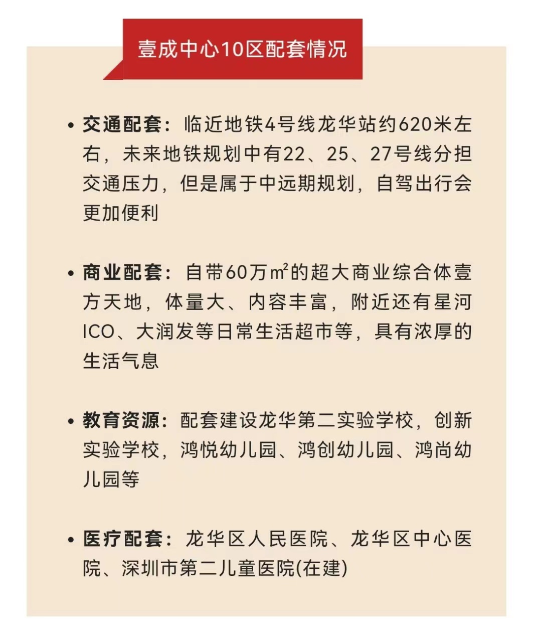 轨道交通:目前距离项目最近的地铁站点是4号线龙华站,从10区过去步行约800米左右,壹城中心10区算是离地铁口相对较近的一个区,其它区去地铁口会更远。需要关注的是,规划中的25号线和27号线会路径壹城旁边,会在8区西侧设置景龙站,在2区南侧(龙华大道和工业路交汇处)设置25/27号线换乘-油福站。
