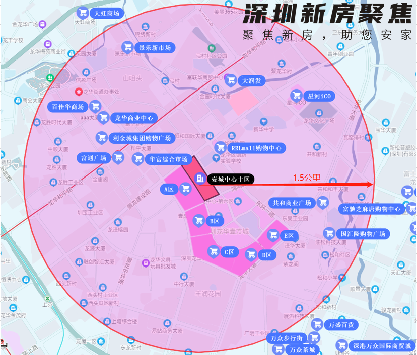 除了自带商业、周边社区商业和临路商铺外,项目1.5公里范围内还分布有RRLmall购物中心、大润发、星河iCO、龙华商业中心、百佳华商场等多个集中式购物中心或商业街区。