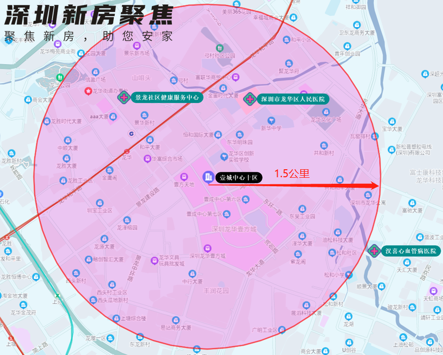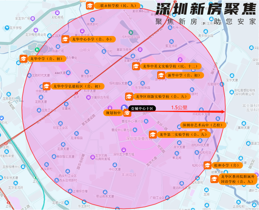 鸿荣源壹城中心项目宗地内配建有3所幼儿园,2所公立九年制学校、另外10区东南侧施工工地规划的是1所公立初中学校和1所幼儿园学校。除此之外项目周边教育资非常丰富,1.5公立范围内还分布有新华中学、龙华中英文实验、龙华中学弘毅校区、龙华中心小学等学校。
