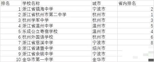 我们看一下上面浙江的高中,从一到十分别是,浙江省镇海中学、浙江省杭州市第二中学、杭州学军中学、浙江省温州中学、乐成公立寄宿学校、杭州外国语学校、浙江慈溪中学、浙江省诸暨中学、浙江省余姚中学和金华市第一中学。
