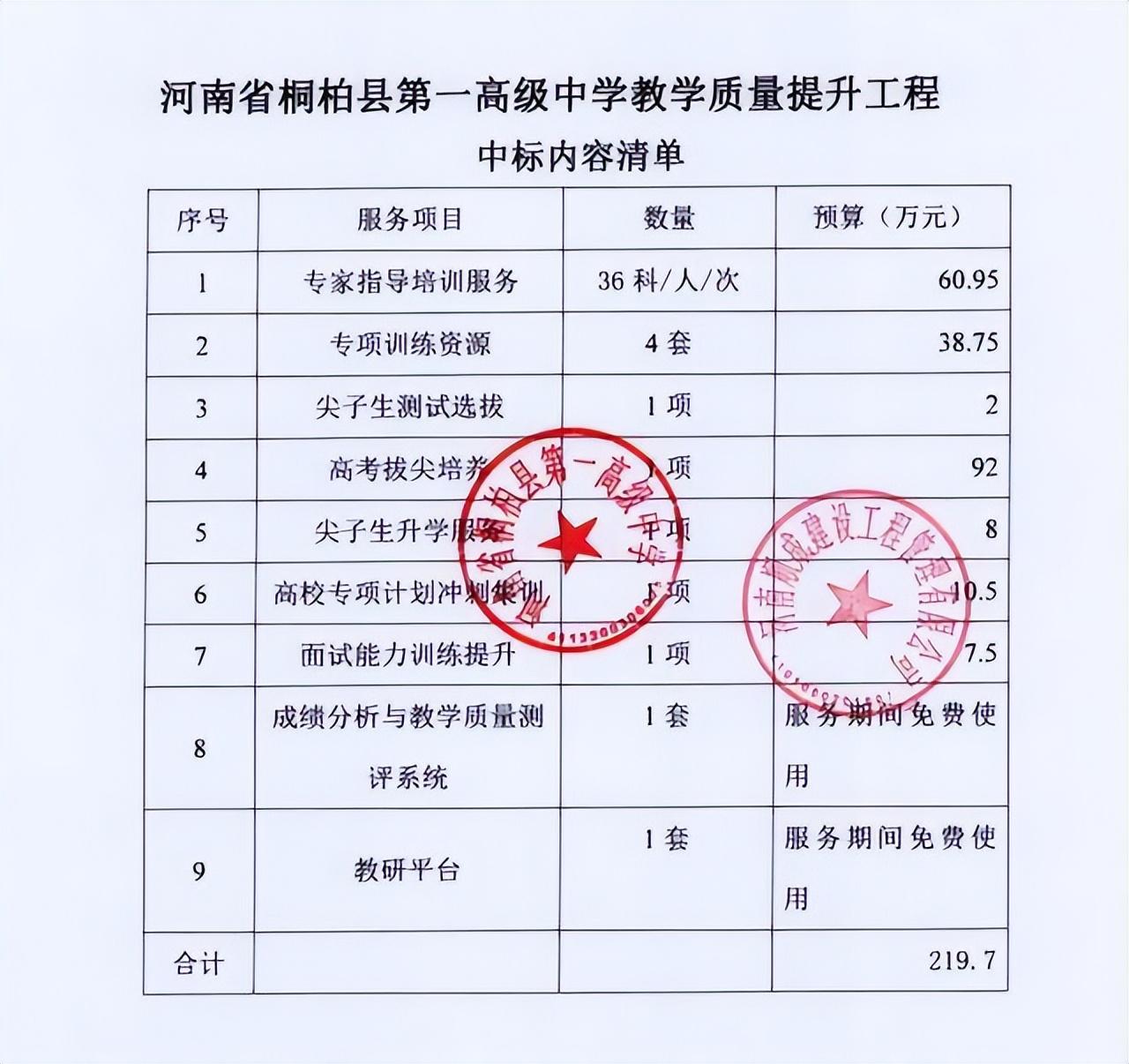 因此学校领导想出了请“外援”的招数,把进一步提升高考升学率的希望寄托在校外培训机构身上。三个月的高考冲刺辅导,售价高达219.7万元。当然并不是培训公司派员入驻学校替代原来的教师教学,而是每月派几名名师专家每月来一次学校辅导一下,定向打造几名潜质好的学生冲刺清华北大,同时据说还提供4套价值近40万的试卷。