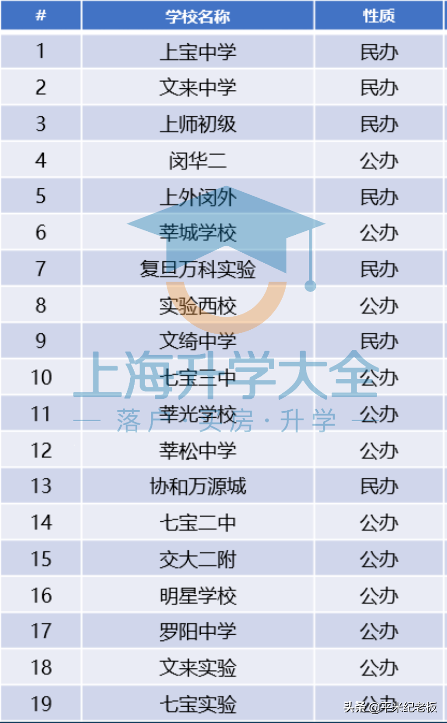 下面是闵行比较好的初中,除了民办学校依然强势,公办里面比较好的初中依次有闵华二、莘城学校、实验西校、七宝三中、莘光学校、莘松中学、七宝二中、交大二附中等。