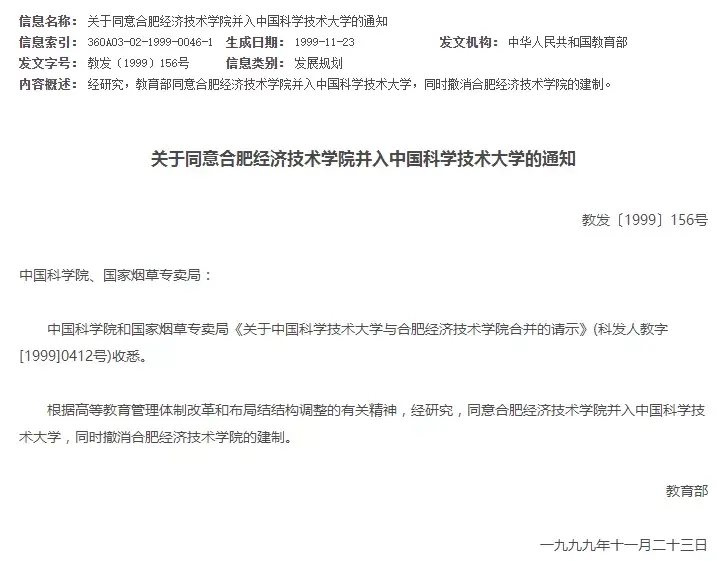 即便是在许多人眼里非常“小而精”的中国科学技术大学也有合并史。2000年左右,中科大合并了中国唯一的烟草类大学——合肥经济技术学院(原名合肥烟草学院),当时该院校国家烟草局唯一直属院校,毕业生面向烟草系统就业。不过现在中科大的招生里已经没有任何烟草学院的痕迹了。