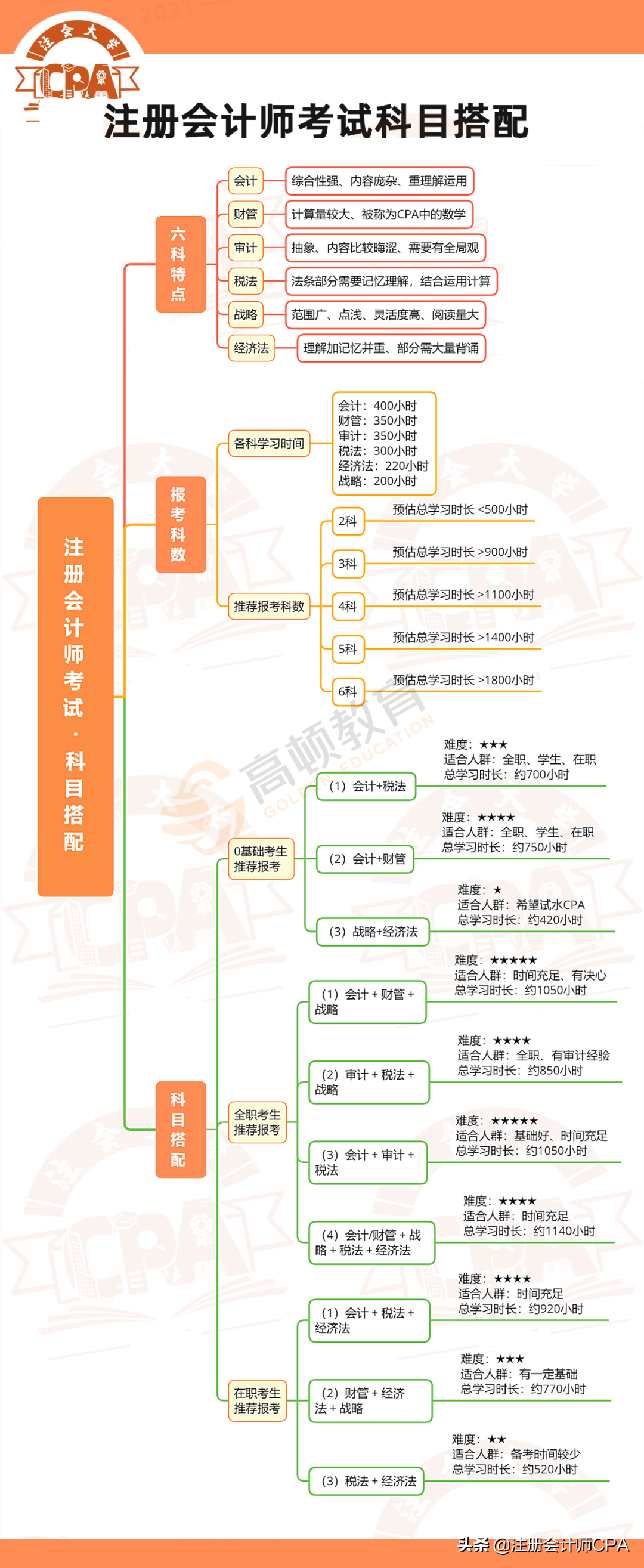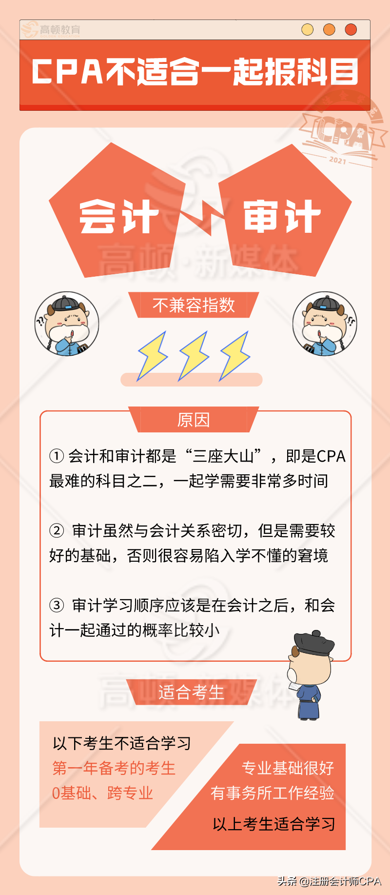 看完以上内容,具体报考几科大概也有个底了!接下来就是科目之间的组合,高顿CPA小编建议考虑几点因素: