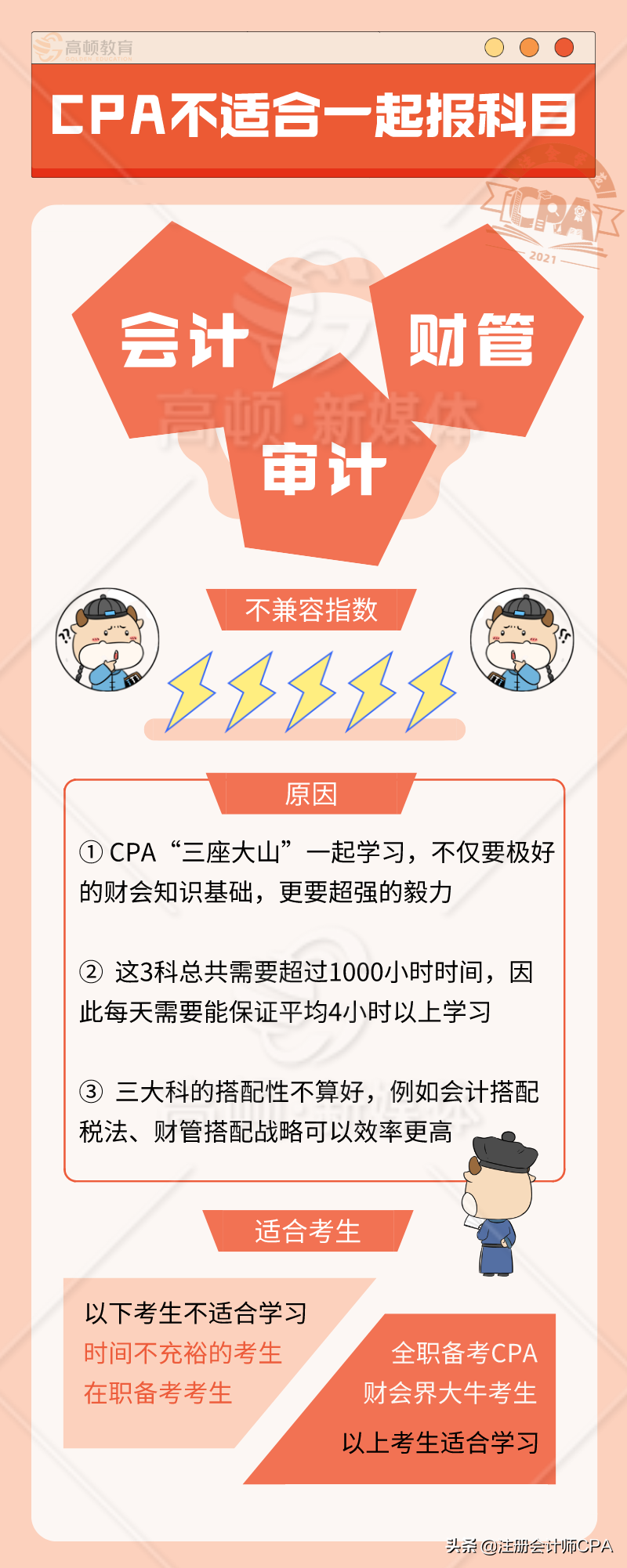 考虑职业发展,例如从事财会类工作可优先报考会计+税法;若从事审计相关,可优先报考会计+审计,但是难度会较大,以下图中也会有一些搭配弊端分析,看看是否可以规避一些呢: