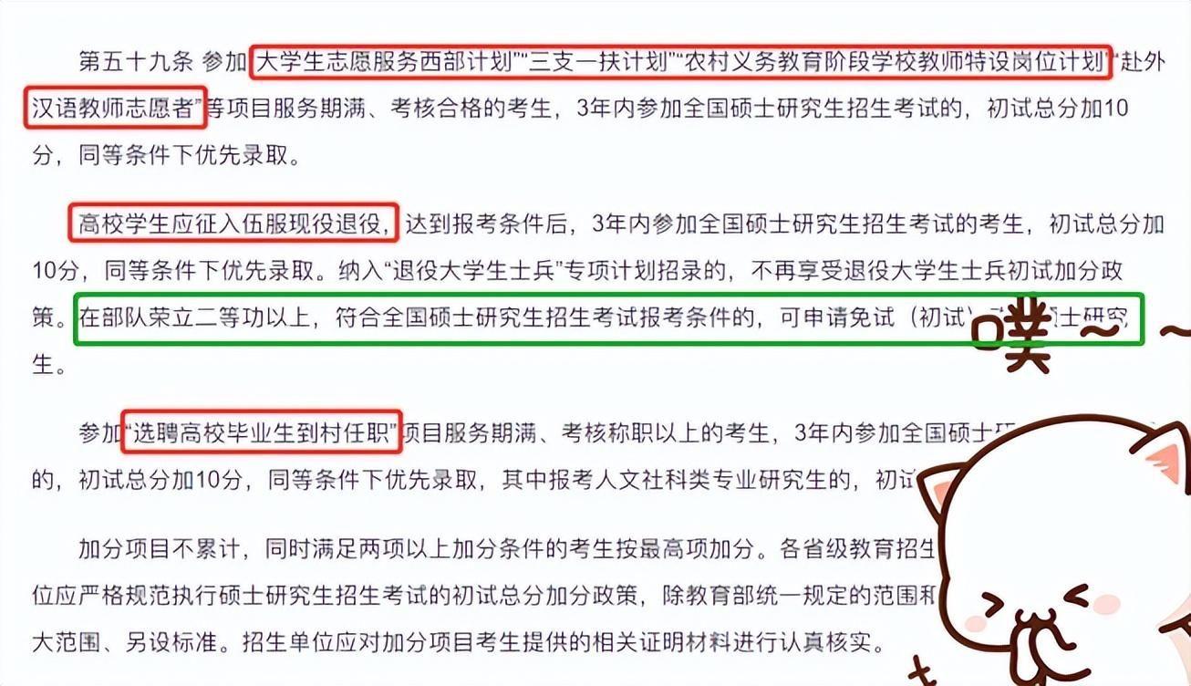 同样在3年内参加考研,初试可以加10分。这类大学生还有一点好处是其他考生没有的,如果报考的是人文社科类专业研究生,初试可以加15分。