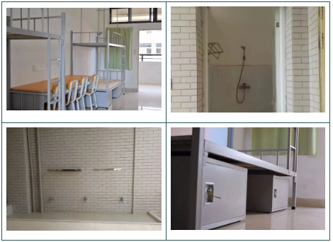 廉江校区宿舍为8-10人间的上下铺,均有热水供给洗澡,有独立的卫浴室,配备桌子、椅子。