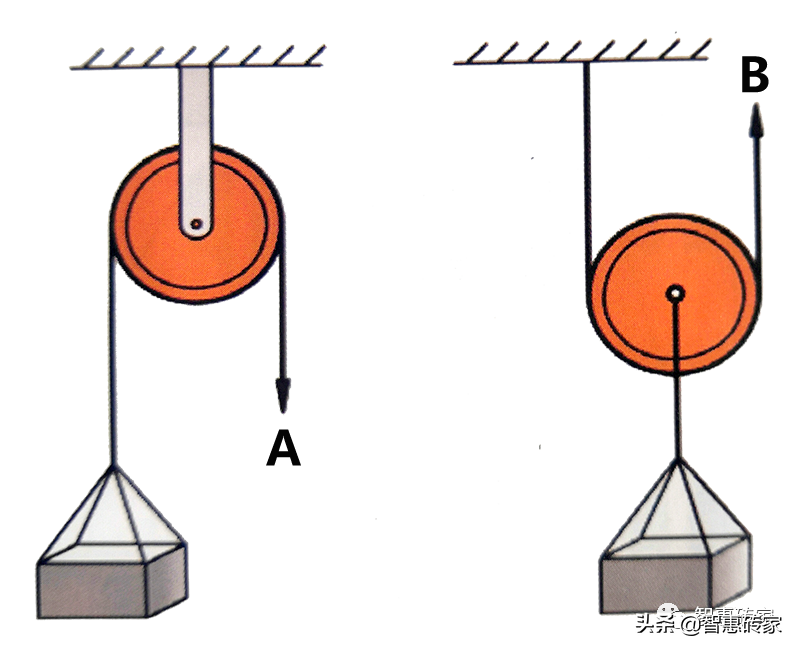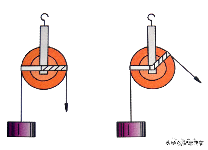 ① 改变力的方向。定滑轮改变力的方向是可以根据实际情况来确定的,并不一定是反方向,如上图中展示的是两个不同的施力方向,这两个力的大小是一样的。