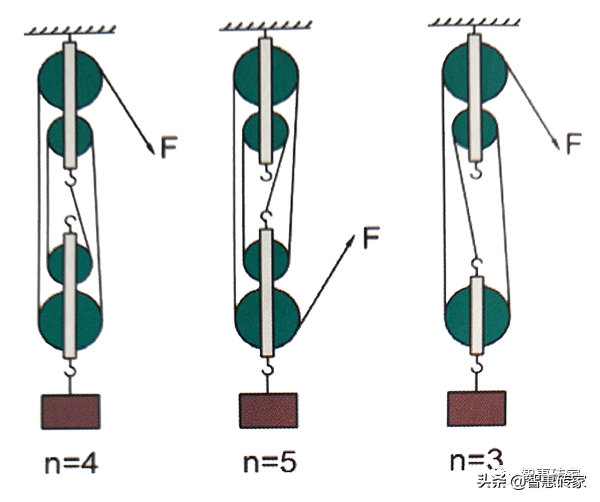 ② 滑轮组用几段绳子吊着物体,提起物体所用的力就是总重的几分之一。绳子的自由端绕过动滑轮的算一段,而绕过定滑轮的就不算了。如上图所示,绳子的段数只计算绕过动滑轮的绳子段数,在图中左侧的滑轮组中是4段绳子,所以所需的力是物体总重量的四分之一。