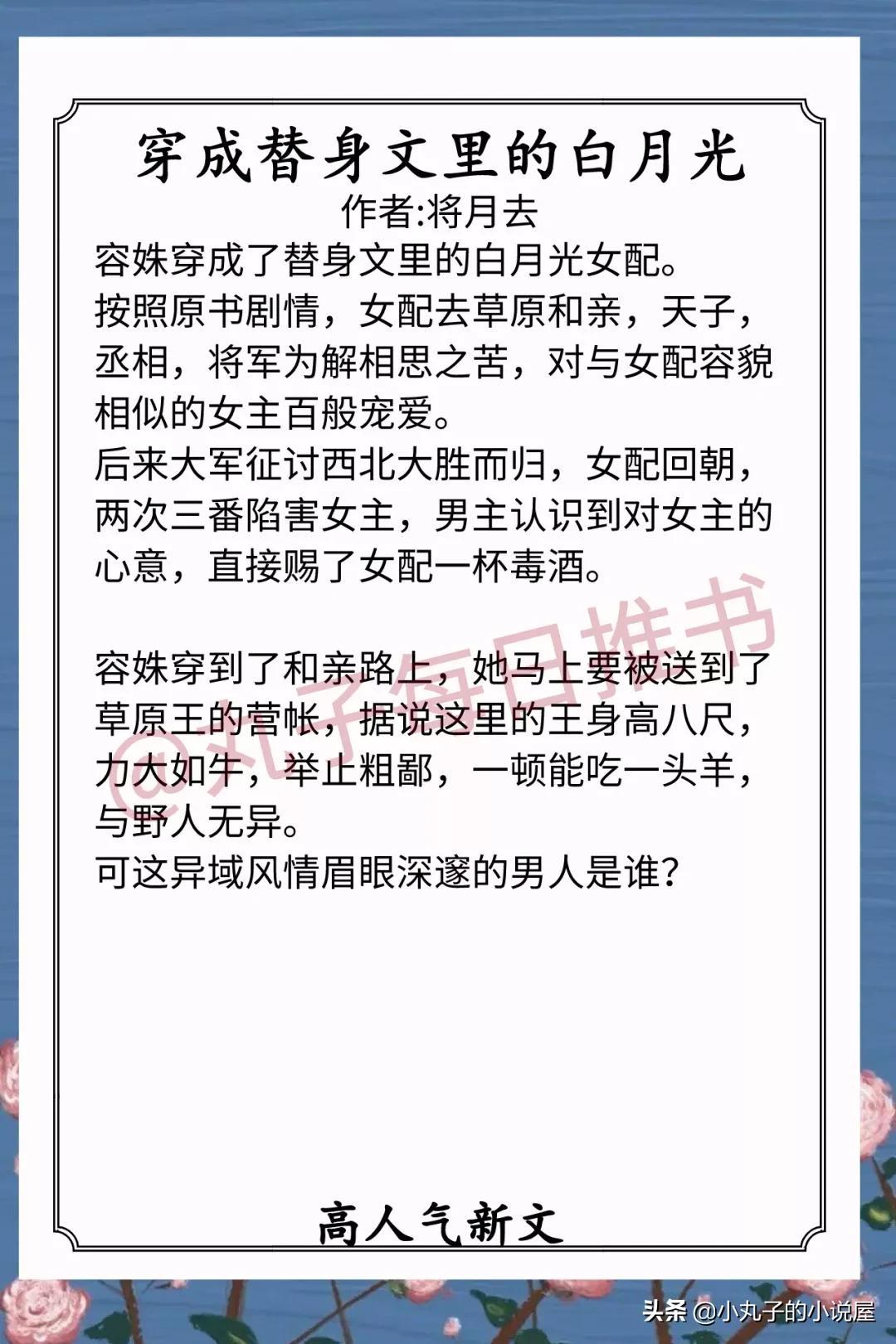 1.《穿成替身文里的白月光》 作者:将月去(娇气白月光vs宠妻草原狼王,穿书,替身白月光梗,种田美食,一点点狗血加争霸,偏日常向)