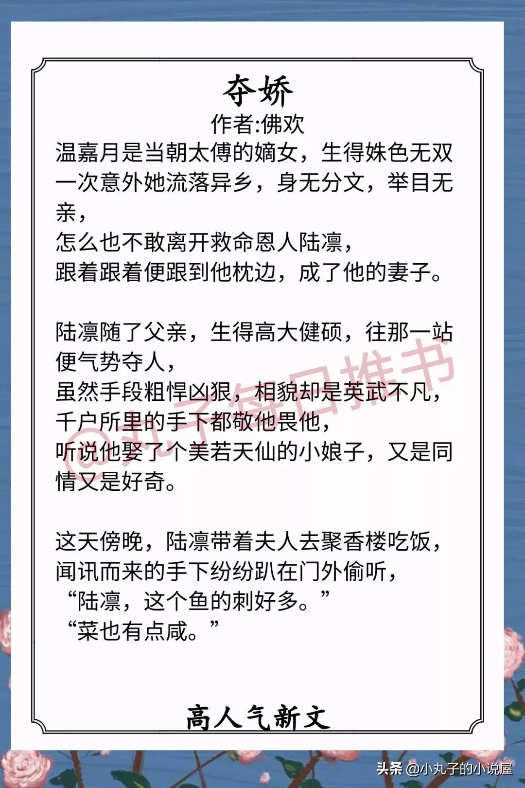 2.《夺娇》 作者:佛欢(身娇体软落难千金vs人狠话不多地方千户,男宠女,狼狗驯化手册 ,年龄差8岁)