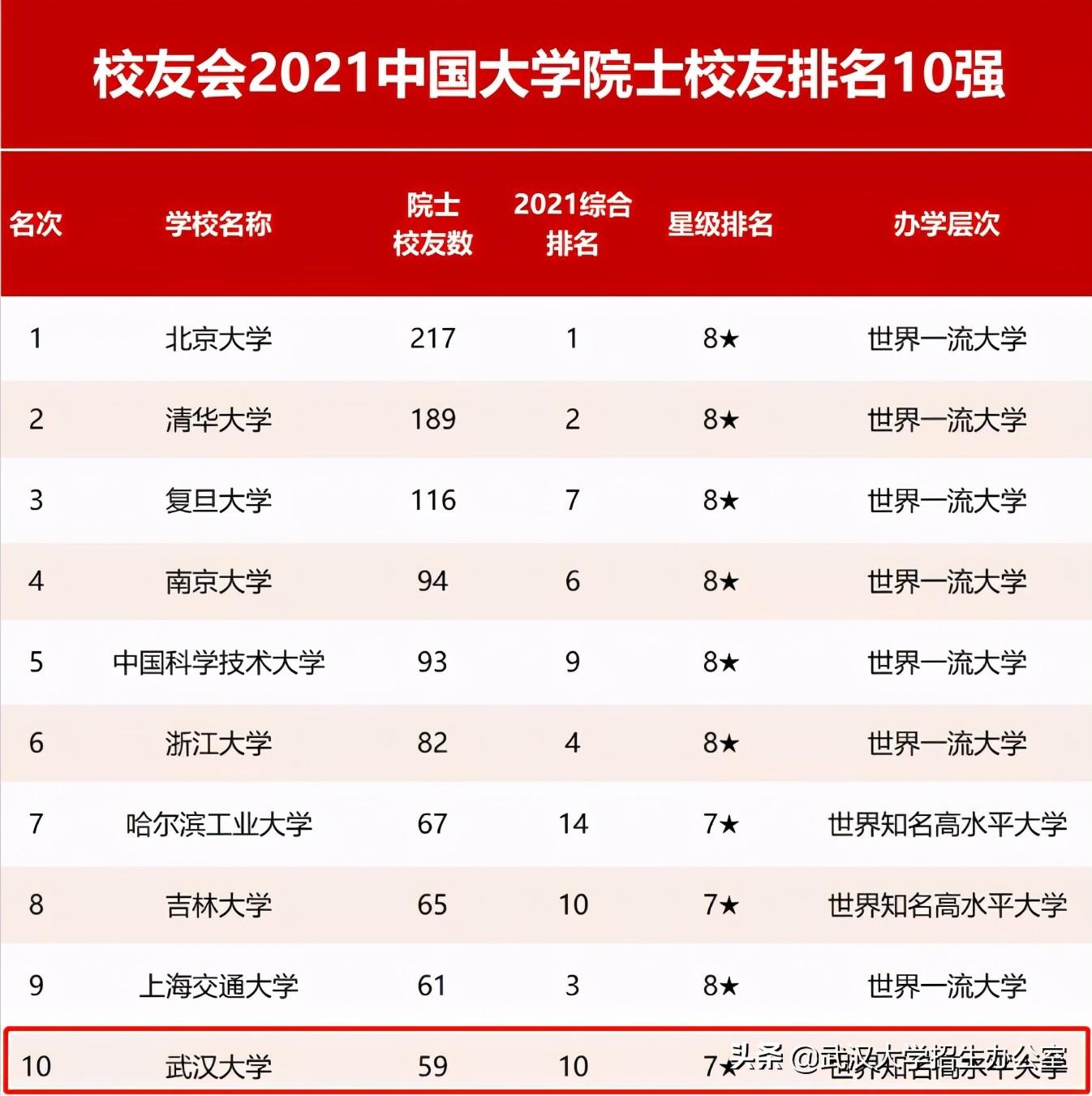 校友会院士校友排名:第10位武汉大学培养造就了59位中国两院院士和国际院士,位列校友会2021中国大学院士校友排名第10位。