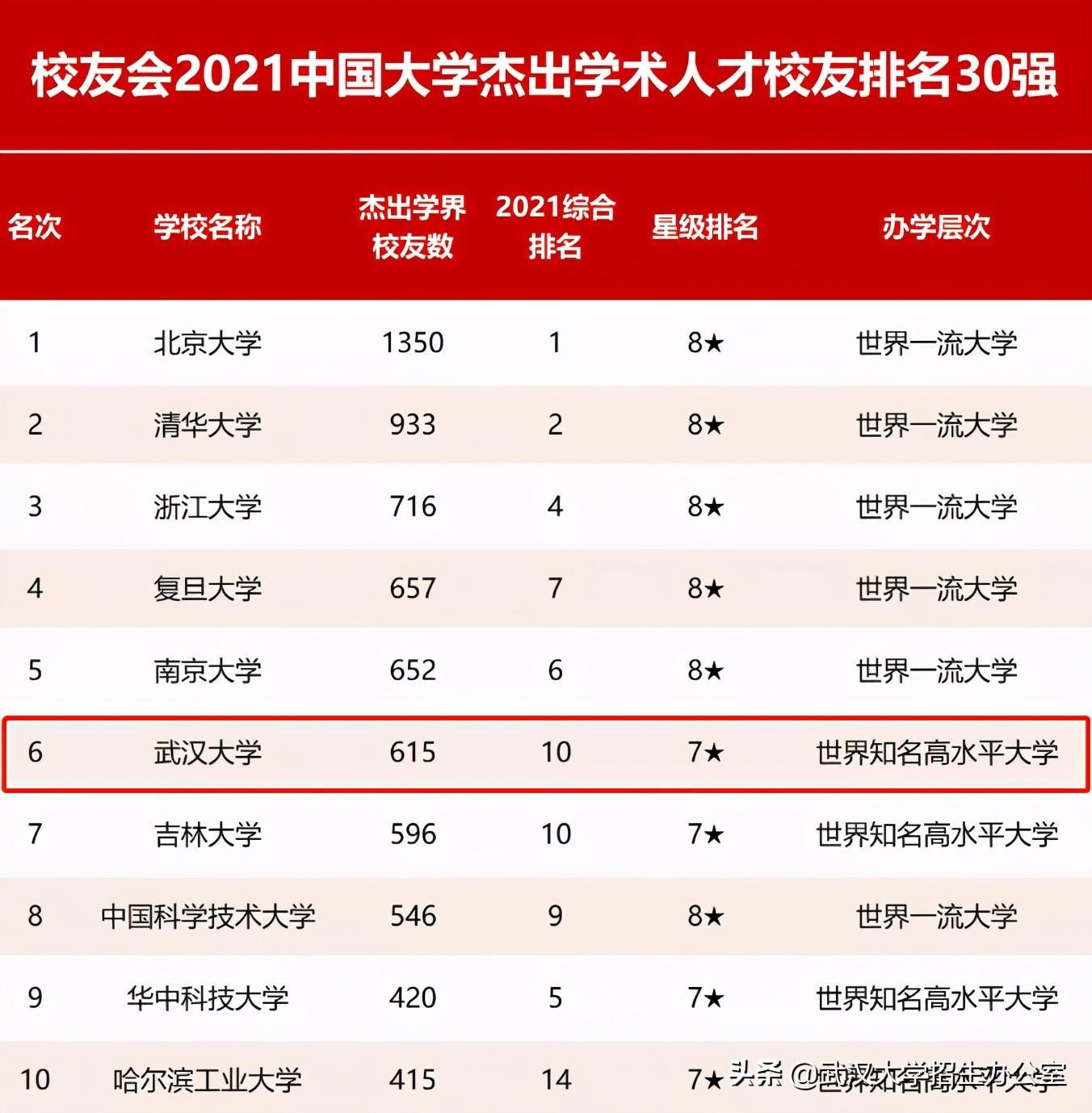 近日,艾瑞深校友会网公布“校友会2021中国大学杰出校友排名”,据统计,1952年以来,武汉大学共培养造就我国政商学文艺体等领域杰出人才948人,位列榜单第六位。