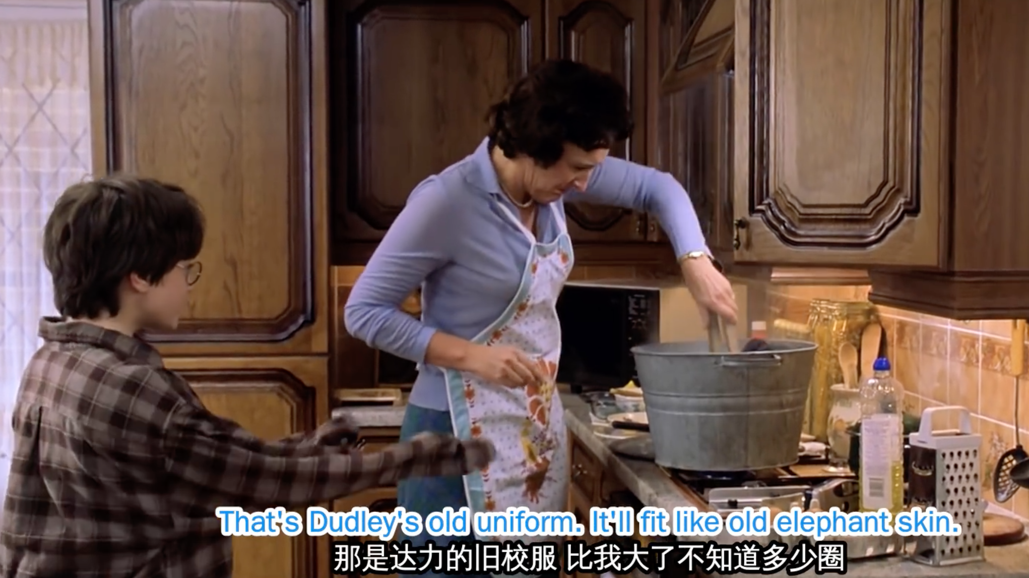如果留心看电影的服装会发现,哈利在姨妈家的一系列服装都是大很多,因为他一直表哥的衣服,都很大。连校服也是佩妮姨妈把达利的校服染色后给他。注意英文,更有趣“it’ll fit like old elephant skin”(我穿着就像大象皮)。