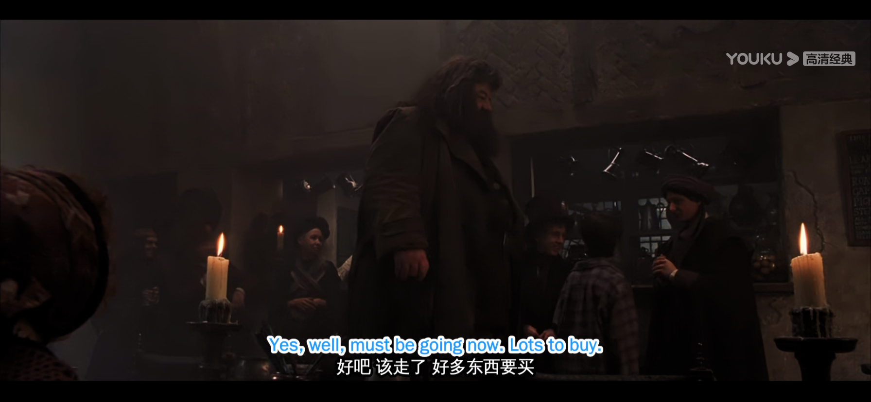 第一部另一个重要人物奇洛教授也在破釜酒吧出现了,看过第一部的观众应该都知道,最后奇洛是黑魔王的手下,要夺走魔法石,但是哈利的手碰到奇洛,奇洛就会烧伤。在破釜酒吧,哈利主动跟奇洛握手,但是奇洛没有伸手——算是为后面埋下伏笔,如果这里握手了岂不是就剧终了……