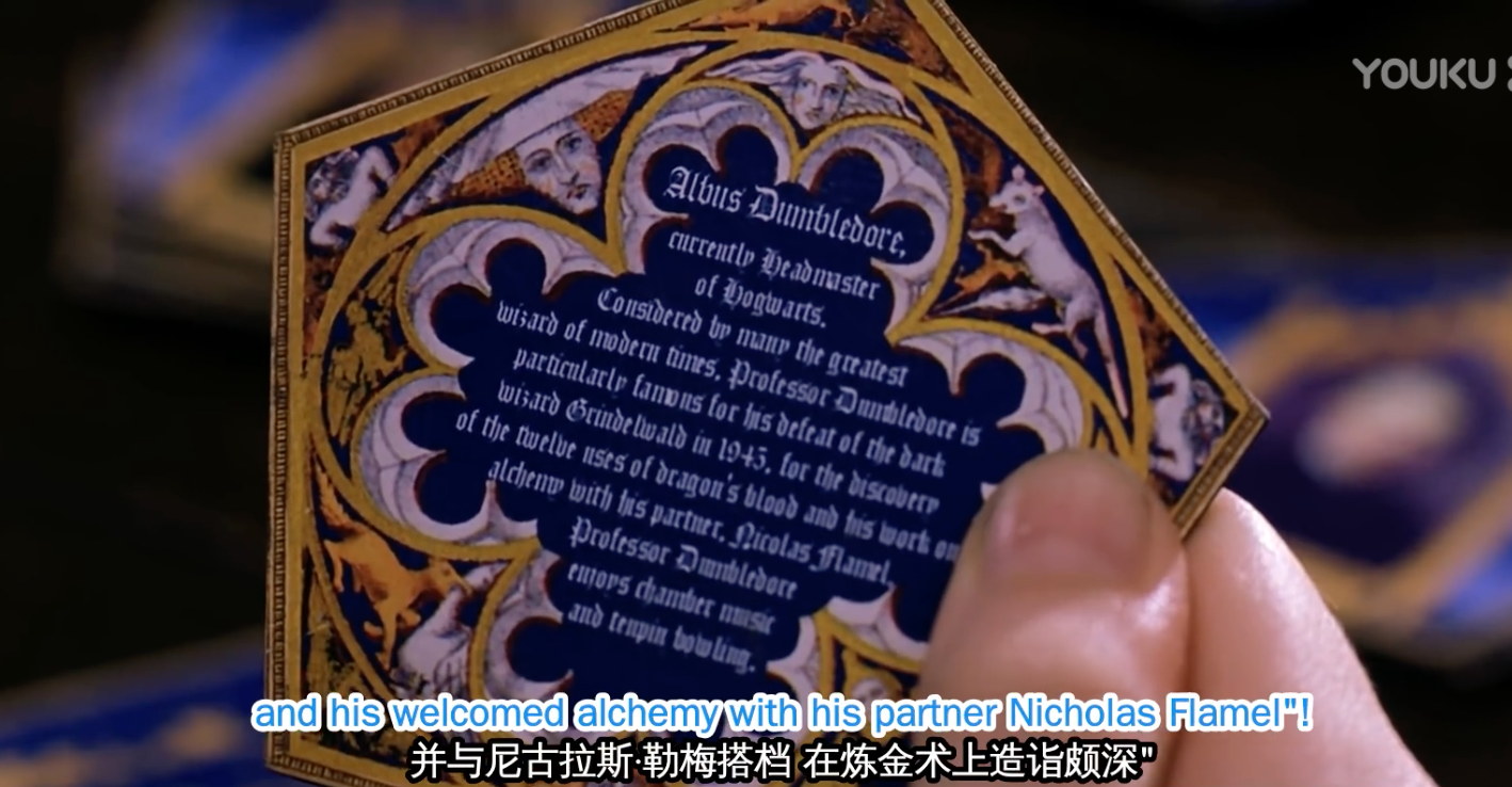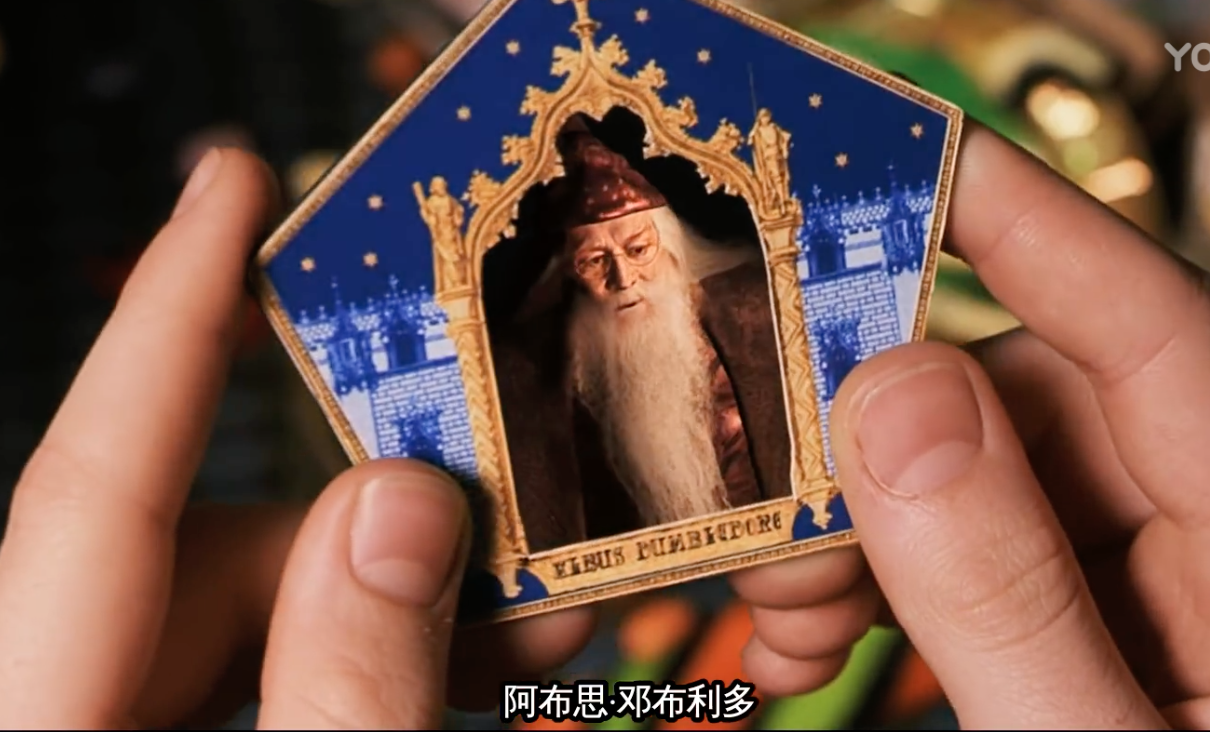 土豪哈利买了一堆,其中巧克力蛙里的卡片,哈利就拿到了邓布利多,这张卡片上邓布利多的简介有很多伏笔,提到邓布利多打败黑巫师格林德沃(记住格林德沃,在第七部和《神奇动物》系列中都会考),提到邓布利多跟炼金术士尼克·勒梅一起炼成了魔法石。