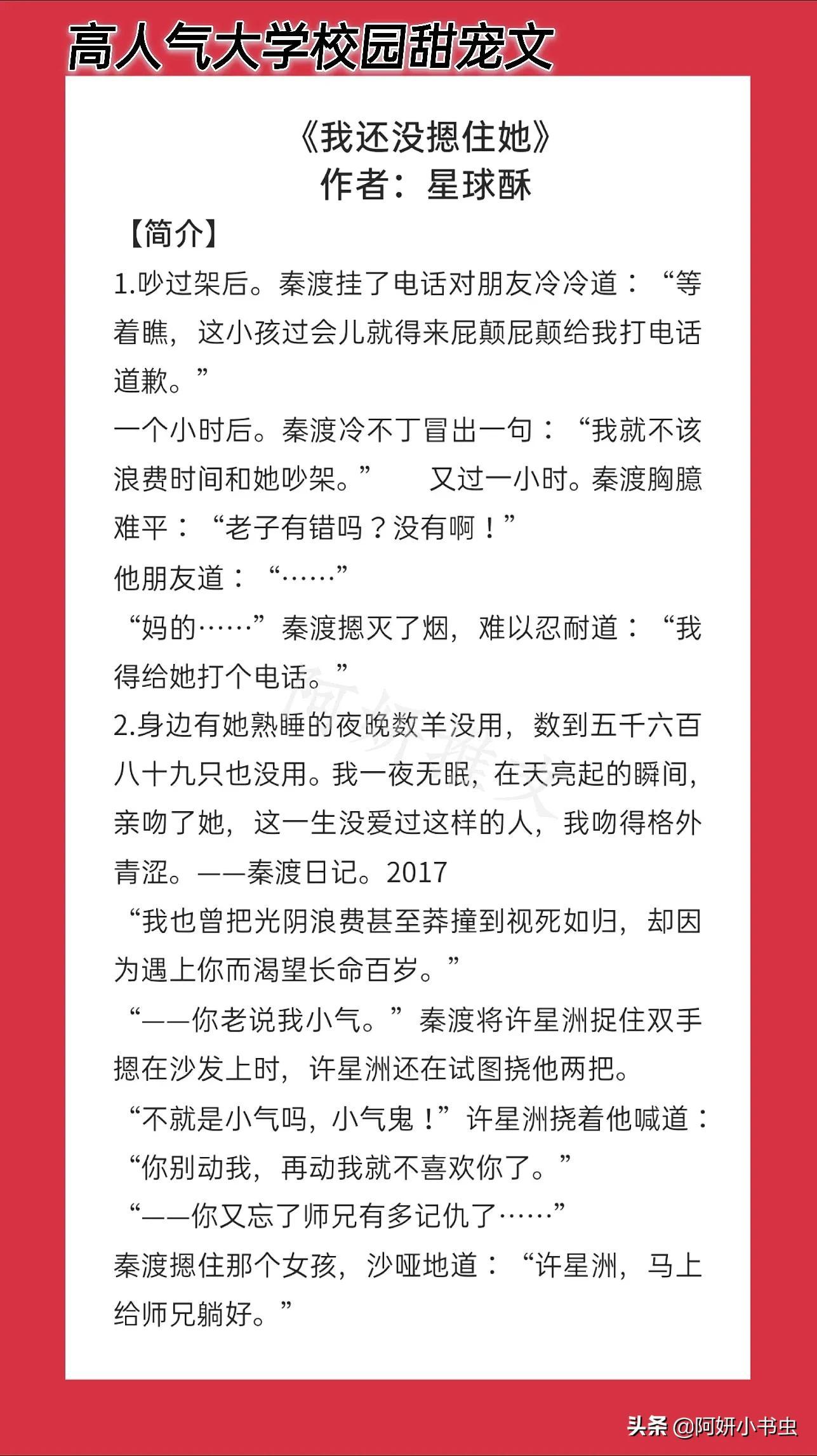 今天推荐的是:大学校园小甜文!青涩的爱情,美好的开始,甜甜的恋爱,漫天撒糖,甜到上头甜到酣。男女主的性格都极其有意思,作者文字细腻美好,青春洋溢,故事情节不落俗套,又甜又萌,温暖治愈,是不可多得的佳作。