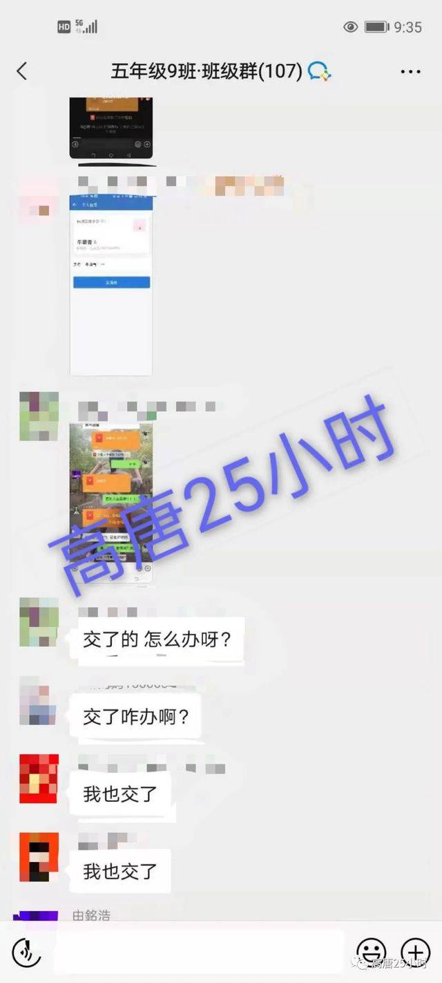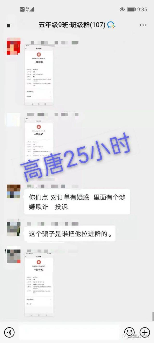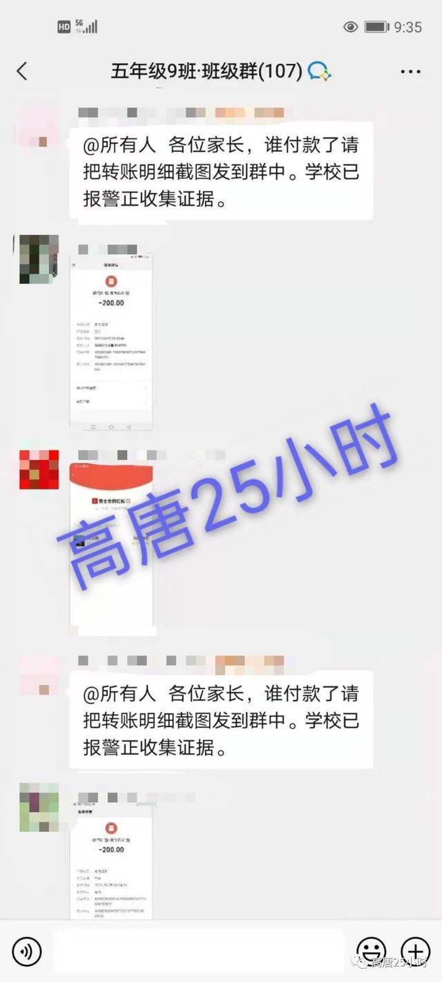 3月25日网友发布,今天上午8时许聊城高唐某小学群有骗子冒充老师发布收费信息,有20多名家长转账被骗金额近4000元。目前校方已报警,希望警方尽早破案将骗子绳之以法!