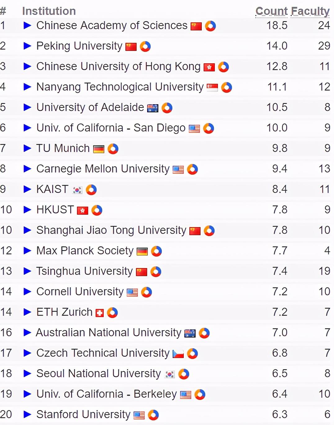 在计算机视觉这部分,中国科学院排名第一,北京大学排名第二;香港中文大学位列第三位;