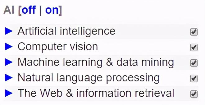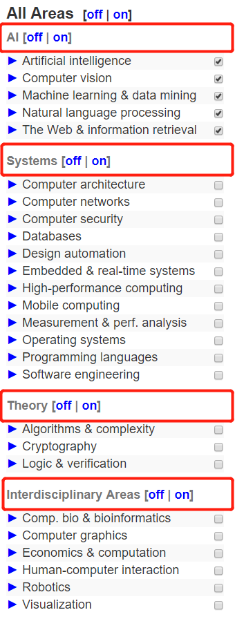 CSRankings在进行具体排名时,将计算机科学领域分为AI、理论、系统、交叉科学四大板块,每个板块包含若干个方向。