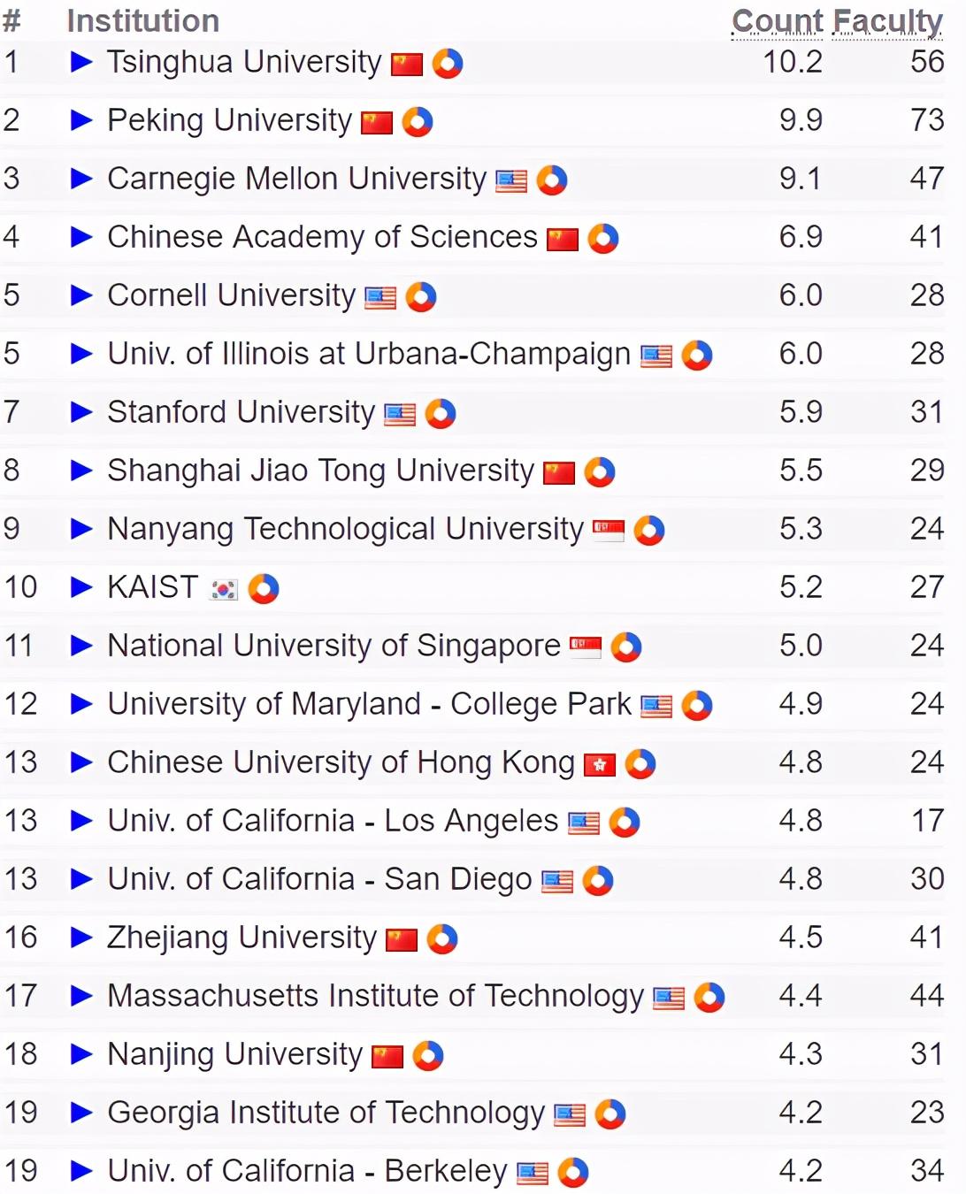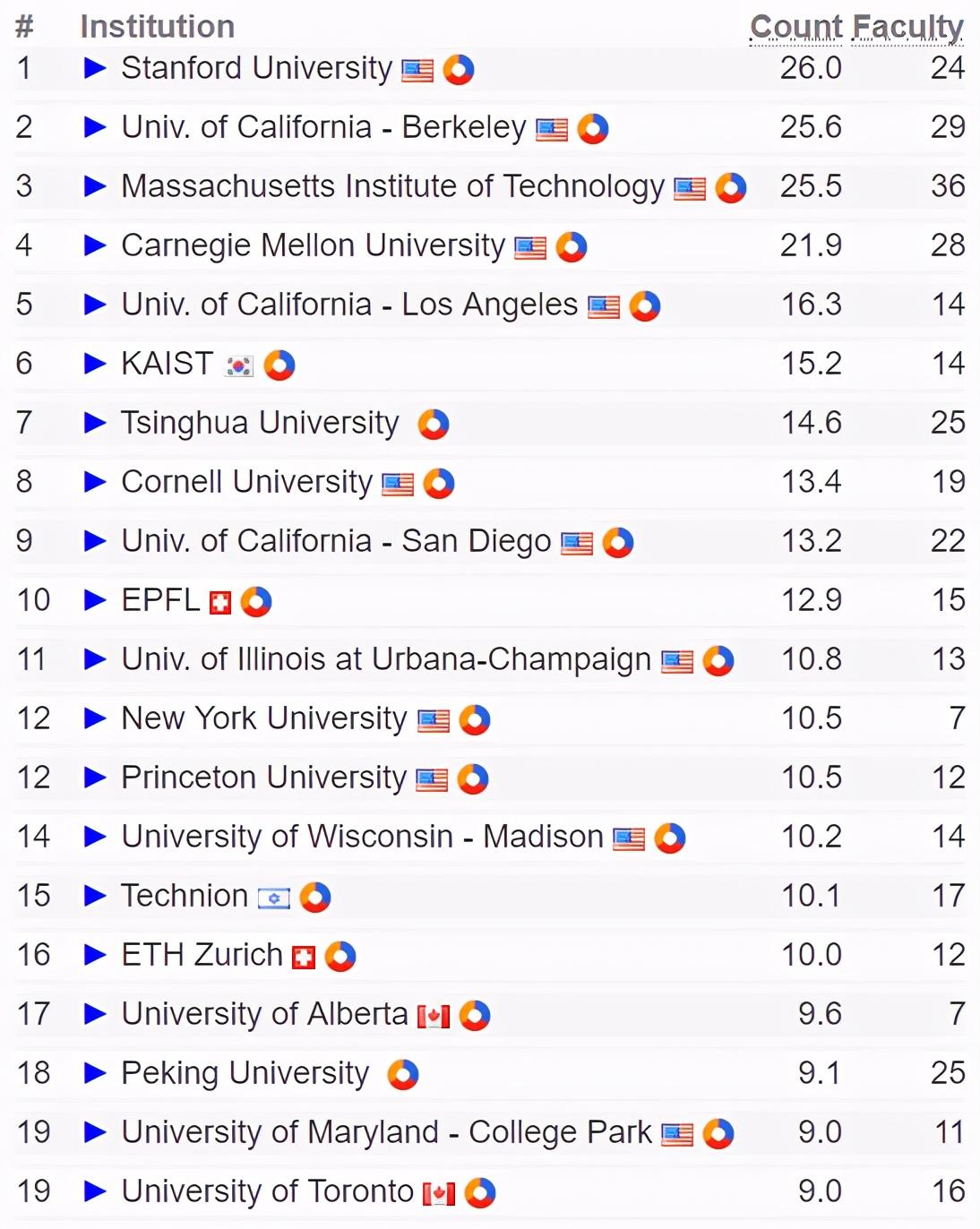 该排名是依据是研究机构教授在各计算机科学领域顶级会议上发表的论文数量。