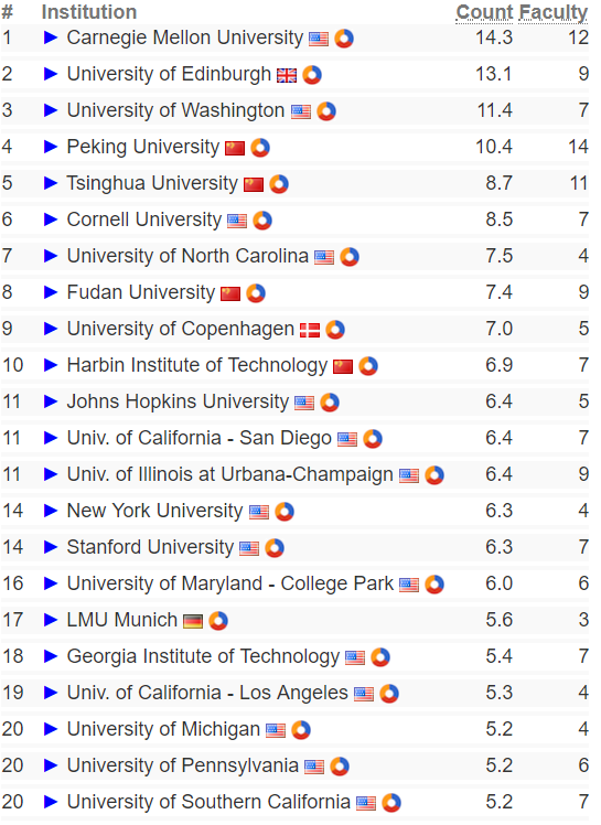 这部分排名前十的学校为:卡耐基梅隆大学、爱丁堡大学、华盛顿大学、北京大学、清华大学、康奈尔大学、北卡罗莱纳大学、复旦大学、哥本哈根大学、哈尔滨工业大学;