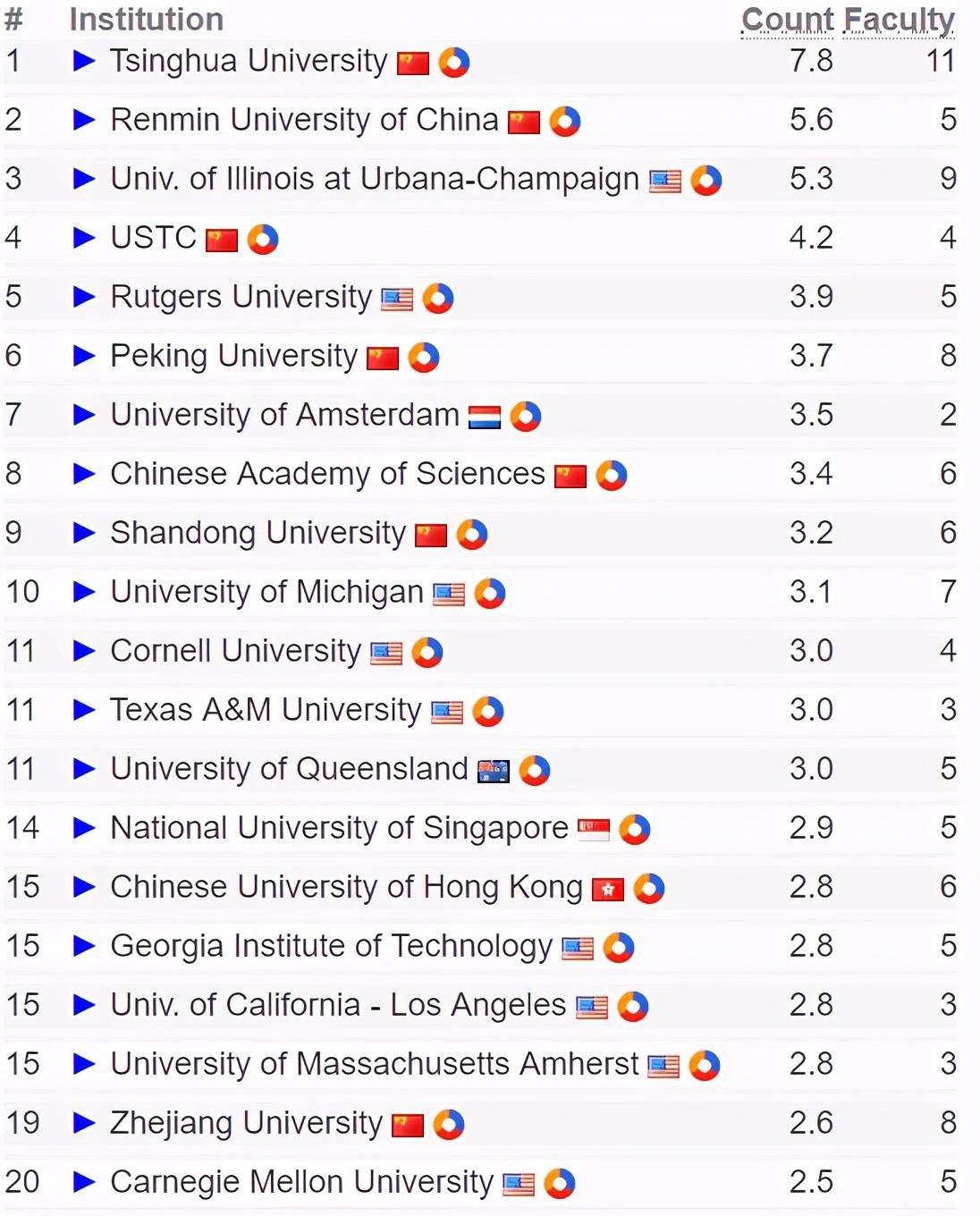 排名前10的分别是:清华大学、中国人民大学、伊利诺伊大学厄巴纳-香槟分校、中国科学技术大学、罗格斯大学、北京大学、阿姆斯特丹大学、中国科学院、山东大学、密歇根大学;