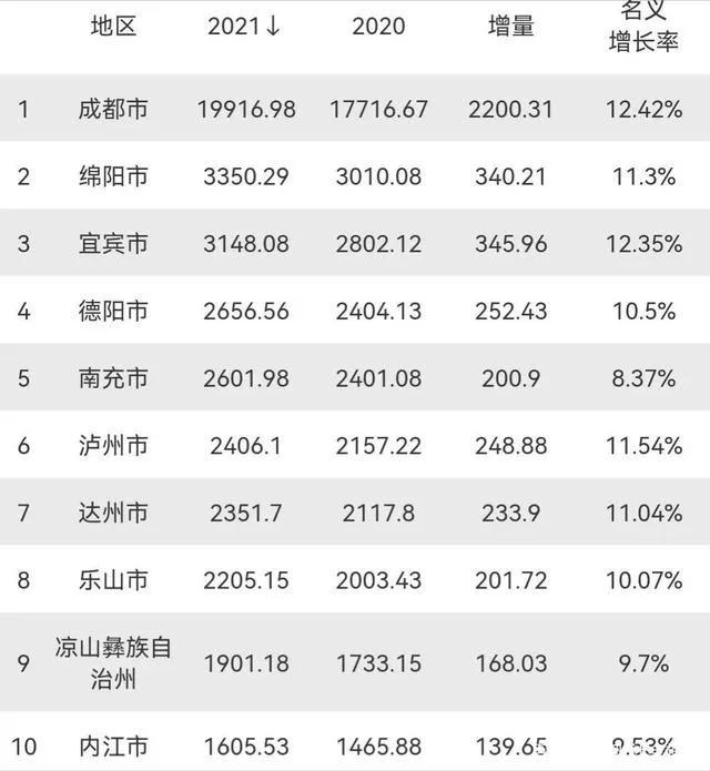 如上图所示,相比于2020年来说,南充市2021年地区生产总值同比增长了200.9亿,同比增长率为8.37%,虽不及成都、绵阳等城市,但是,南充市的经济发展也位居四川省第5名,且与德阳市、宜宾市等地相差不大。