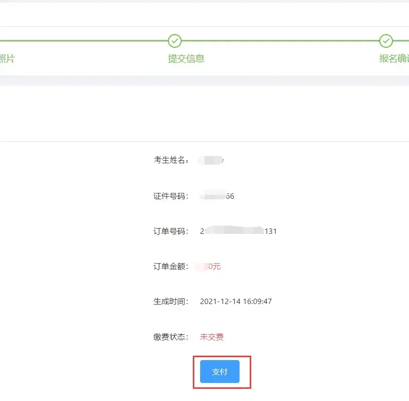 未开通网上缴费的考区,“资格审核”节点变为绿色即表示报名成功。