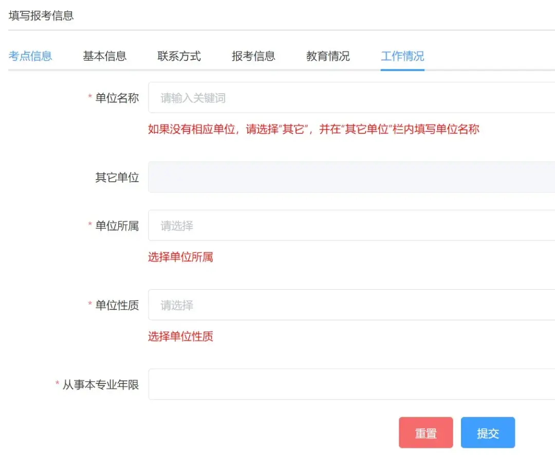 6.如实填写工作情况,包括“单位名称”、 “单位所属”、“单位性质”和“从事本专业年限”。