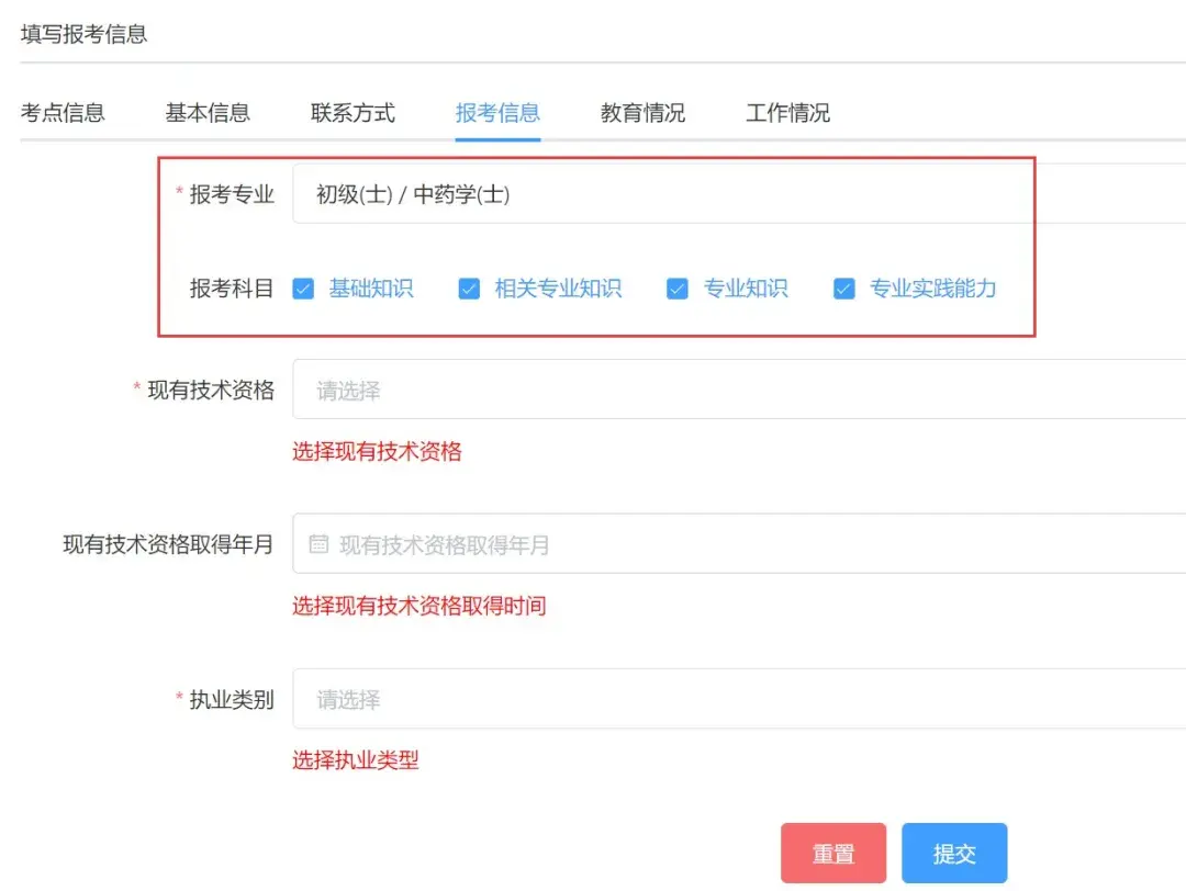 考生须根据本人真实情况,依次填写“现有技术资格”、“现有技术资格取得时间”和“执业类别”。