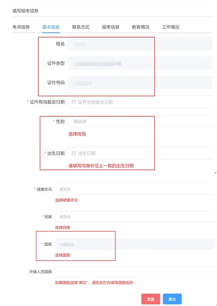 2.基本信息会根据考生注册时填写的内容自动判断引用;其中“性别”、“出生日期”如未引用,考生可手动选择;“健康状态”、“民族”请根据实际情况选择;持外国人永久居留证、海外高层次人才居住证报考的考生,“国籍”请选择“其他”,并在“外国人员国籍”栏中填写具体国籍名称。