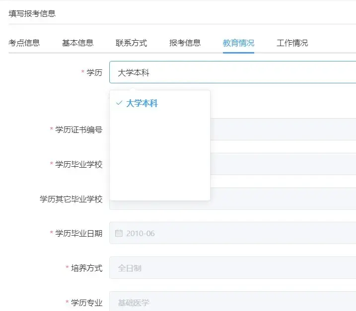 5.“学历”和“学位”信息须下拉选择,直接引用基本信息中【学历学位信息维护】的内容。如需修改,请退出当前考试项目,在【学历学位信息维护】中新增正确内容后,再次进入考试项目,选择引用正确的学历、学位信息。