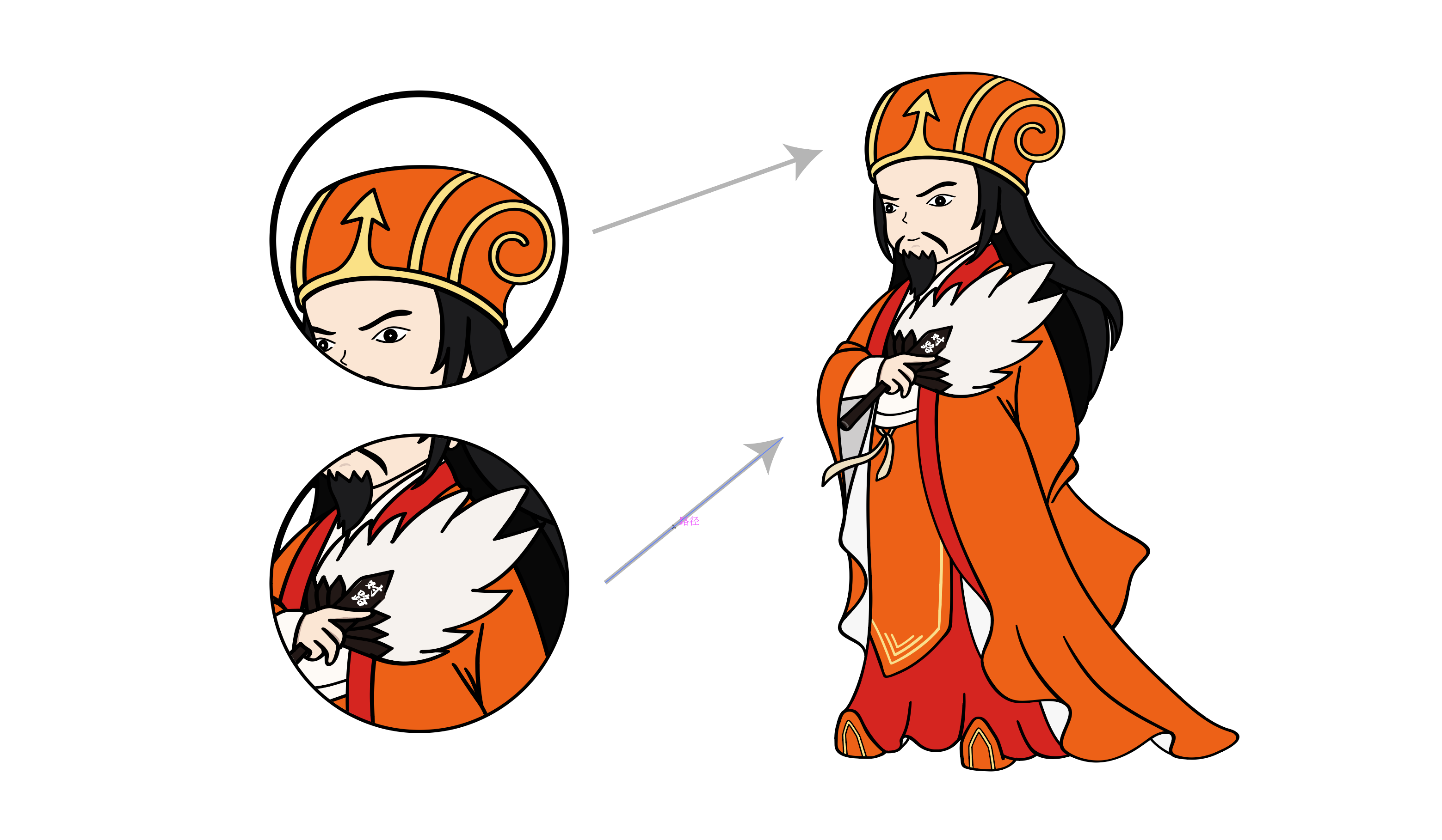 但是,不一样的部分只有10%,另外90%都和其他诸葛亮形象一模一样;而不一样的这10%呢?分别是通天冠帽子和白羽扇,它们又分别和其他通天冠帽子和白羽扇一模一样,这是诸葛亮标志性的元素。