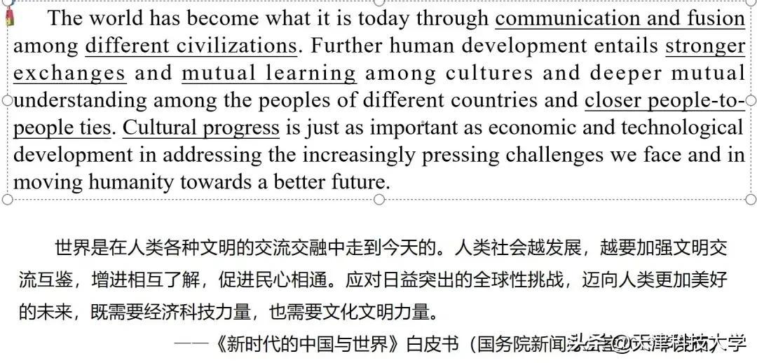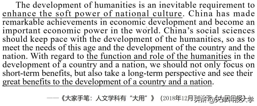 以《英语中级阅读》的第一个单元为例,该单元探讨人文学科是否过时的问题,夏桐枝教授带领团队深入挖掘与中国人文学科发展、社会主义核心价值主题相关的材料。在课程中融入国务院新闻办公室发布的《新时代的中国与世界》白皮书、人民日报发表的《大家手笔:人文学科有“大用”》等英译版材料。将中国权威机构、媒体、书籍发表的材料融入英语课堂,落实大学英语课程讲授中国故事、传播中国文化的使命。
