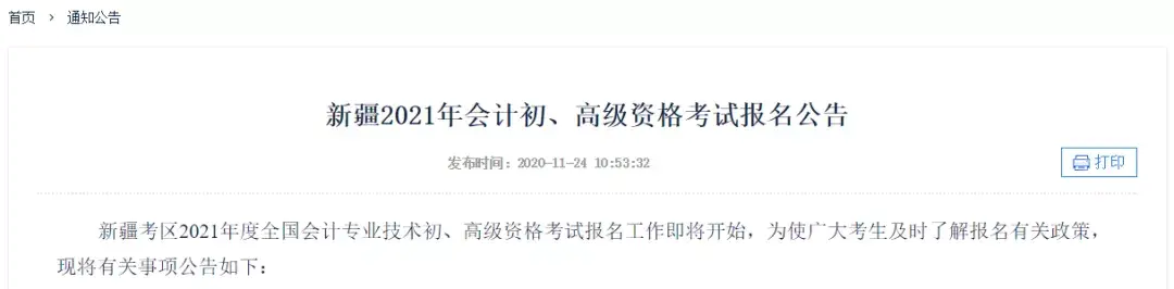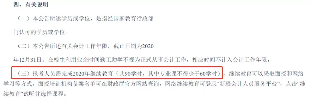 2021年初级会计报名时,新疆财政厅就曾发布公告:报考2021年度全国会计专业技术初、高级资格考试的人员需完成2020年继续教育(共90学时,其中专业课不得少于60学时)