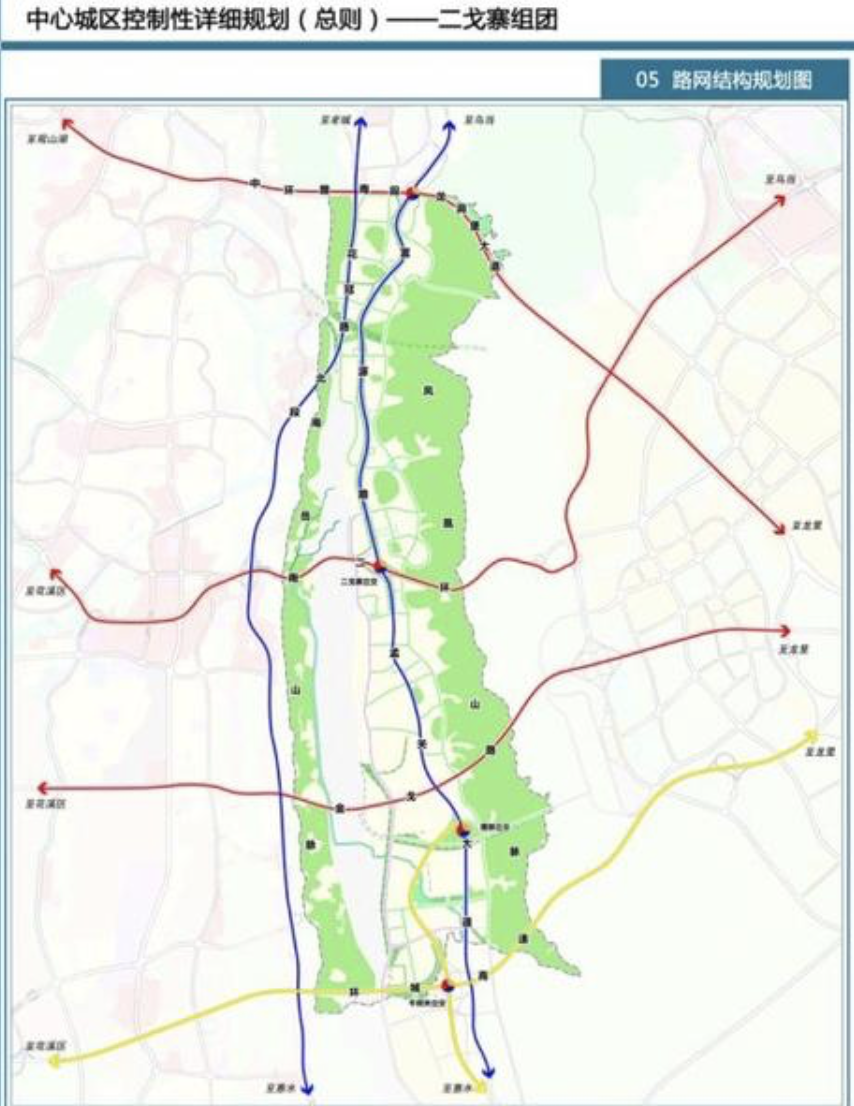 二戈寨组团根据区域路网规划及用地条件,构建“四横、两纵”的道路主骨架体系。