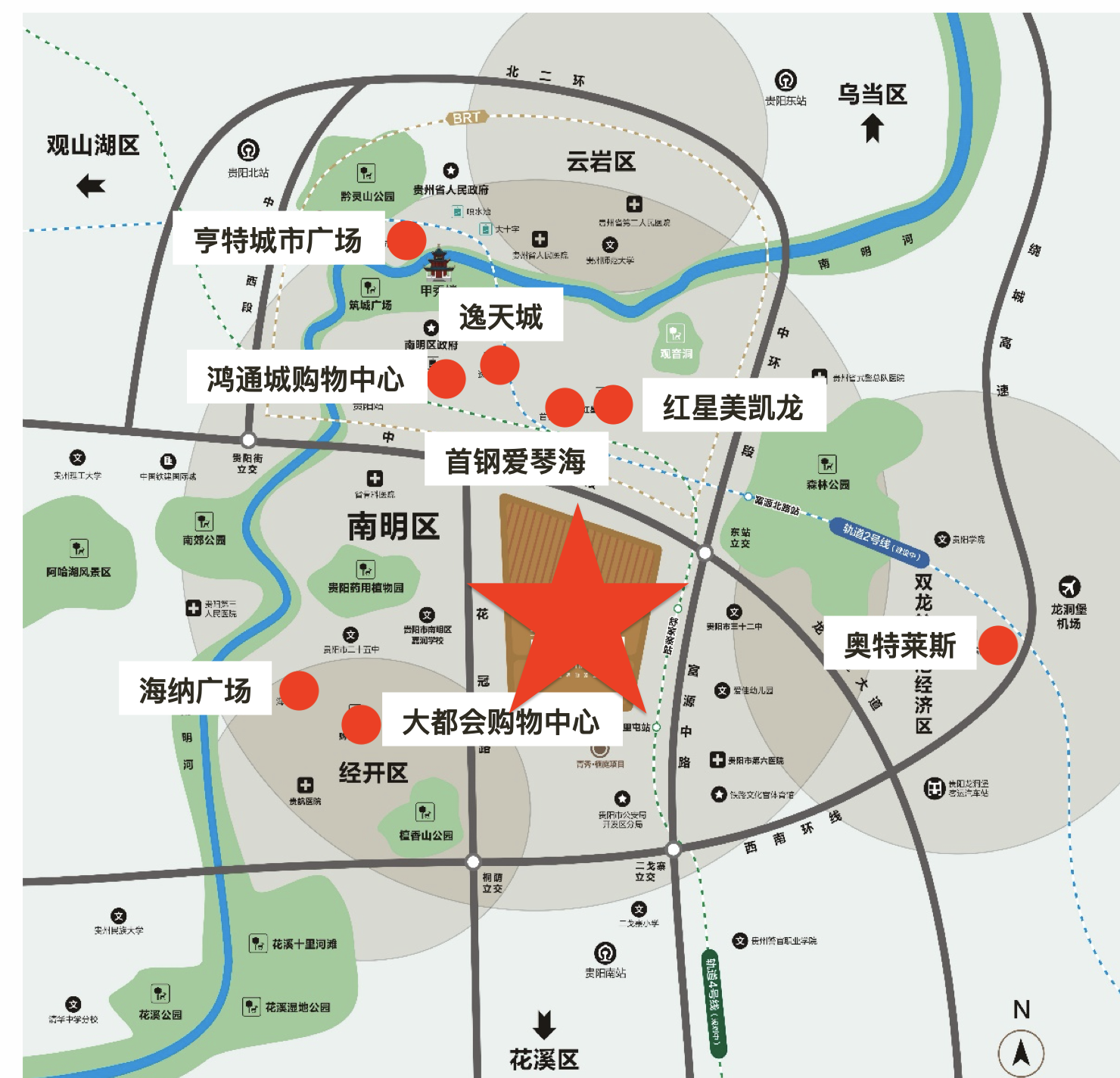 公交线路:中环路---龙洞堡大道、南二环、金戈路、花冠路北段、孟关大道等。