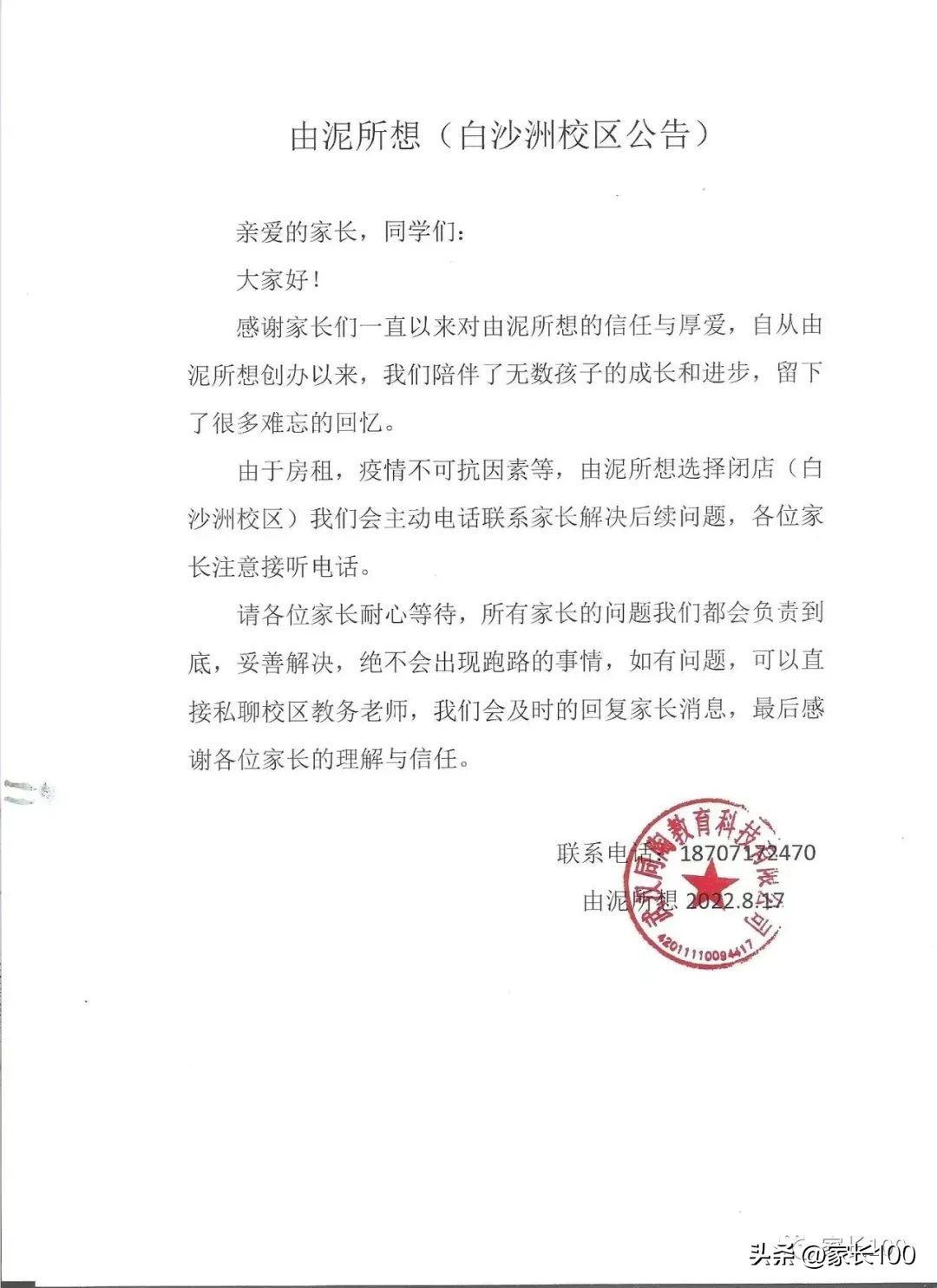 近日,一家名为“由泥所想”的机构,发布了白沙洲校区闭店公告,称“由于房租、疫情等不可抗力因素等选择闭店,会主动电话联系家长解决后续问题” “绝不会出现跑路的事情”。