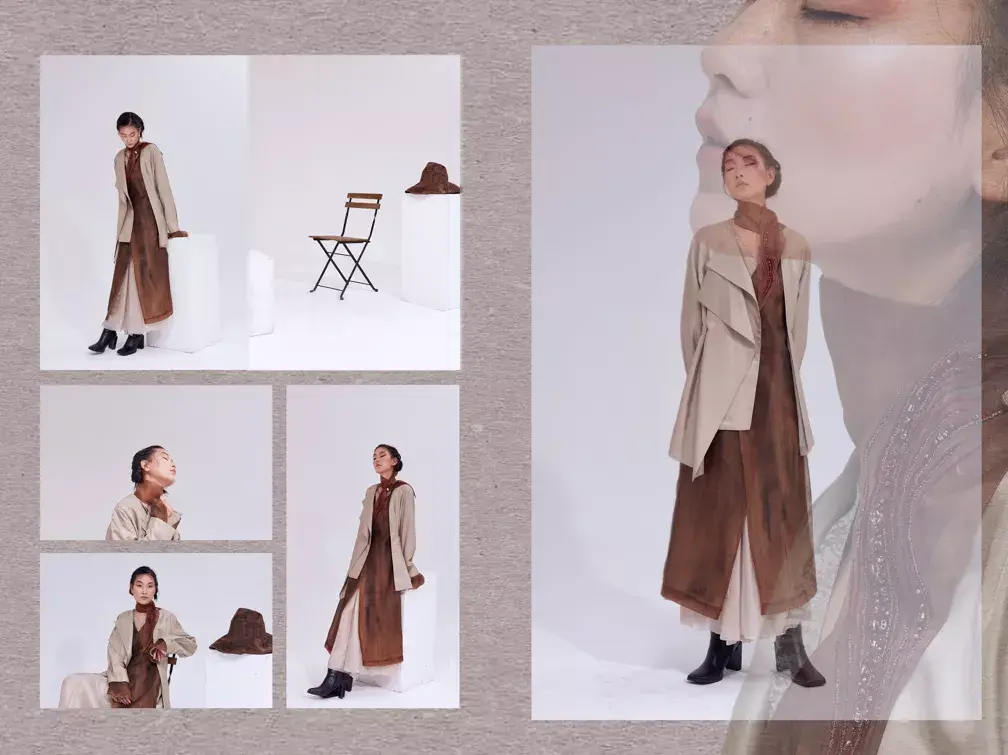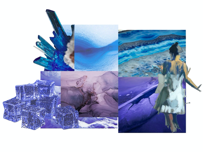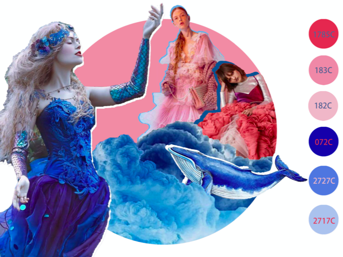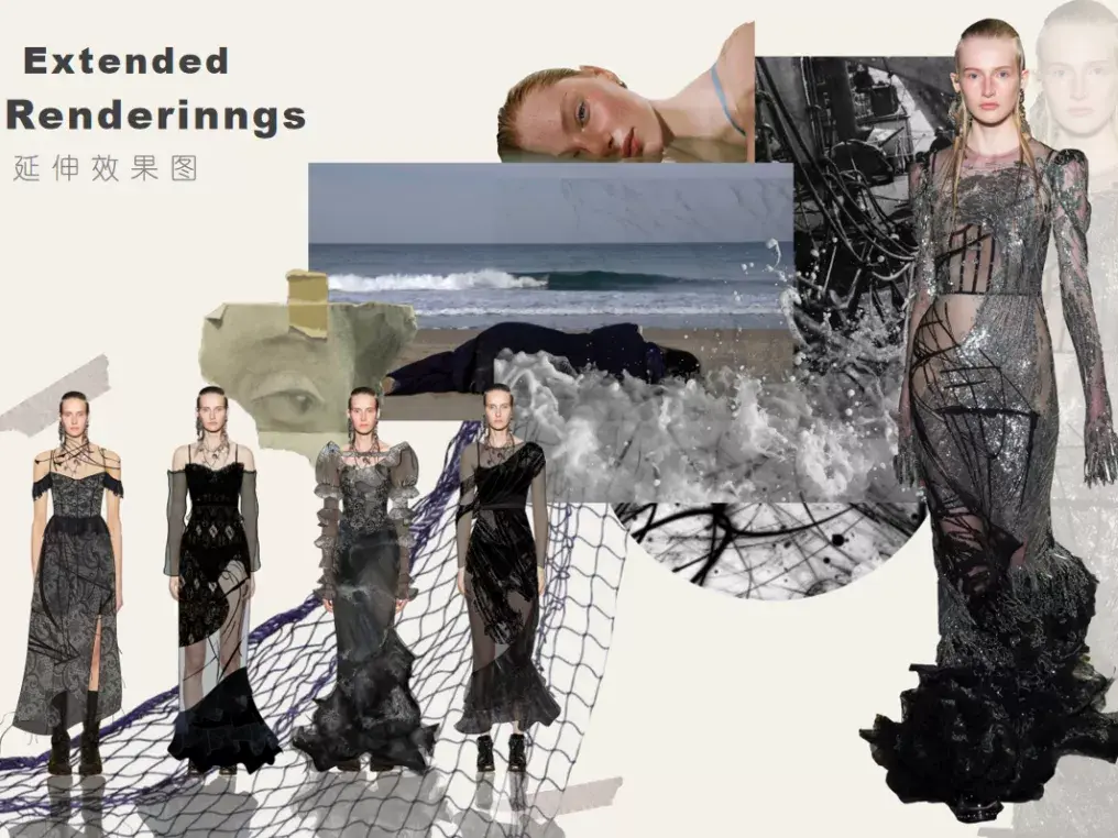 本案设计特点:根据图片颜色定服装设计风格,为达到梦幻的效果,采用欧根纱面料去裁片印花。