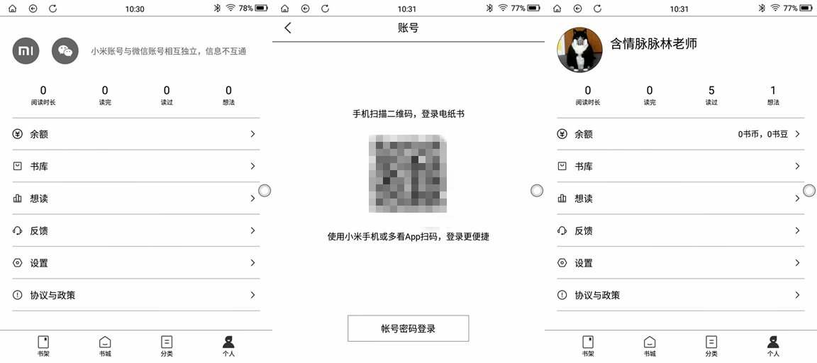 INKPAD进入阅读菜单之后需要登录多看软件的账号,多看软件和小米账号都可以登录,并不互通,由于我之前使用和注册过多看账号,所以直接登录就可以看到我之前阅读和购买的图书。内置的多看阅读界面支持字体,排版,内置的多种字体以由用户自己选择,我个人喜欢兰亭字体,看上去舒服很多。内置的字体当然是越多越好。