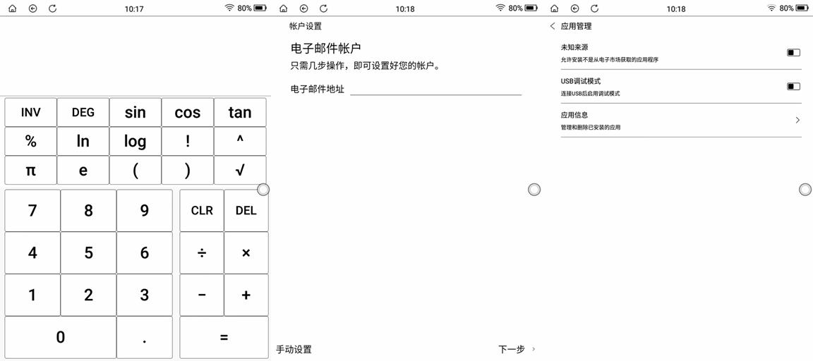 内置的计算器,电子邮件账号,应用管理都比较适合日常使用,如果把它作为InkPad使用收发邮件也是非常方便的。其实安卓这一点上还是比较的实用。很多合适的内置软件得到保留。