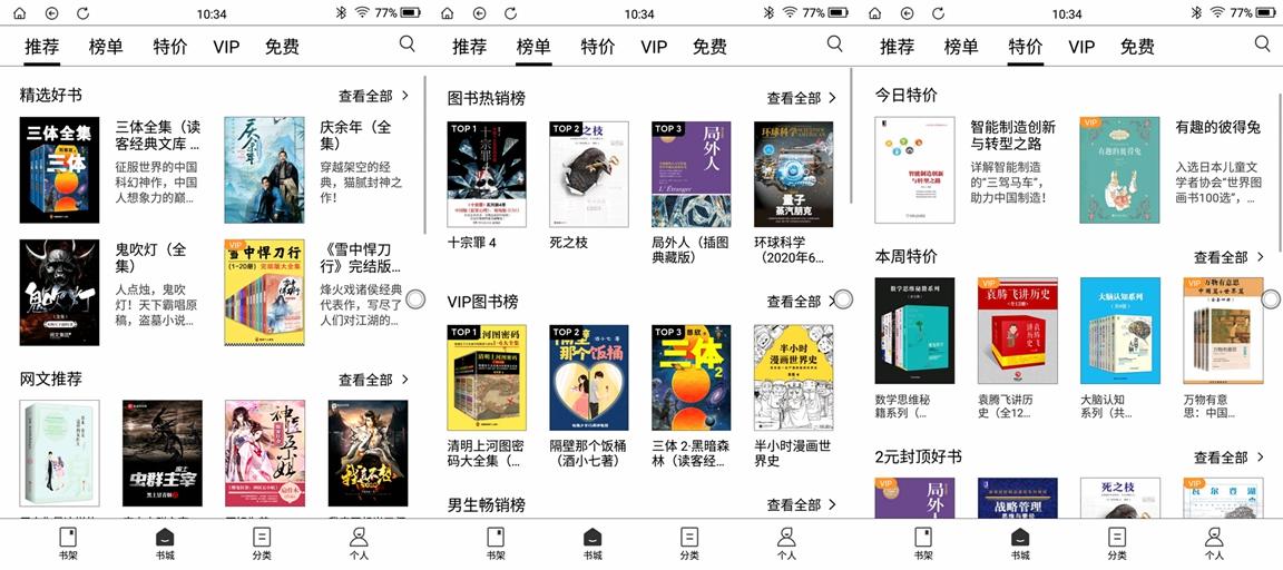 多看书城被小米收购之后这几年在图书内容上也增加了不少内容,整个排版和分类也设计的比较方面,内部分为推荐书单,榜单书单,特价书单,VIP书单,免费书单,如果不想买书,免费的看看也是很好的。为了更方便用户的使用,多看还支持内容分类,如男生,女生,漫画,等等分类。