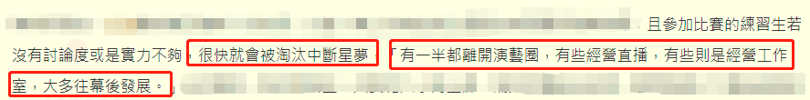 更为残酷的是,如果参加比赛的练习生没有讨论度或是实力不够,那么他很快就会被中断明星梦。
