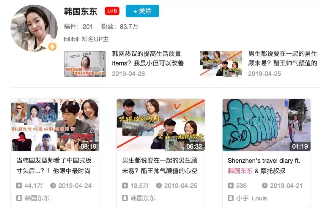 比较著名的Reaction博主像韩国东东,她于2016年开始在B站上传视频,目前已经有83.7万粉丝。她常常邀请她的韩国朋友来一起观看国内的影视剧或综艺节目,纪录他们的想法和反应。
