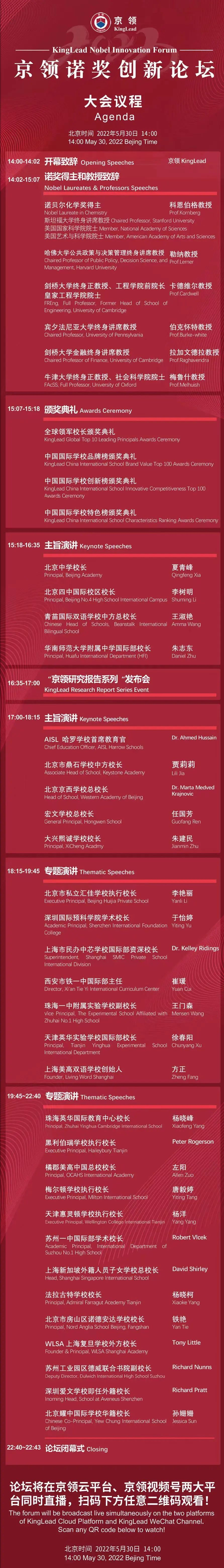 2022年5月30日,京领诺奖创新论坛暨国际学校颁奖典礼在京领平台圆满举办。这是一场以世界智慧启发中国国际教育的创新论坛,是一场极具专业性与影响力的国际学校颁奖盛典,更是一场由京领独家举办,助力教育事业发展、推动行业升级、促进创新人才培养的年度盛宴。参与此次论坛的嘉宾包括诺贝尔化学奖得主,哈佛、剑桥知名教授,全国知名国际学校校长等。