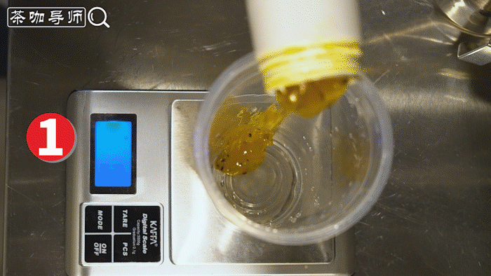 2、第二步用少量的气泡水搅匀。因为浓浆和糖密度比较大,如果不提前稀释搅匀,交给顾客自己去搅拌有难度,影响顾客体验。