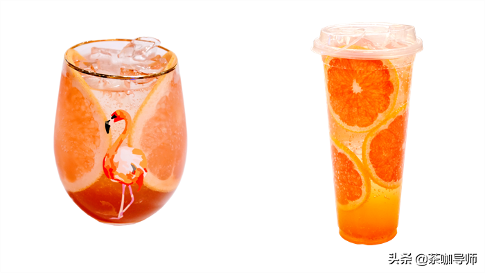 水果和对应的果味浓浆有很多品种,如果我们将第3款的满杯红西柚气泡水的红西柚换成其它片状水果会是什么效果呢?接着学习第4款。