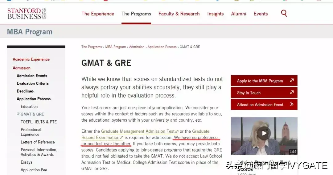 斯坦福大学GSB商学院(Stanford Graduate School of Business)是众多给予GRE和GMAT同等权重的商学院之一。该学院的网站上写道:“We have no preference for one test over the other.我们对两项考试没有偏好。”