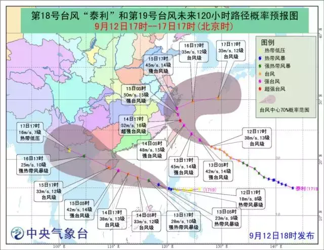 3)今年第18号台风“泰利”正逐渐向浙闽沿海靠近。预计将于明日在福建中部到浙江中部一带登陆,或成为今年来登陆我国的最强台风。